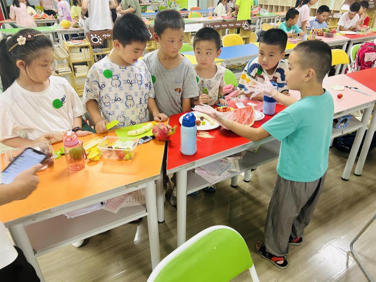 经过几轮激烈的竞拍,一件件水果最终找到了它们的“新主人”。接下来的水果盘制作环节,孩子们以小组为单位,在组长的带领下,小组成员共同参与到切、削、拼、摆的过程中去,集体的智慧与汗水最终凝聚成一幅幅色彩斑斓、形态各异的水果拼盘,让人目不暇接,赞叹不已。同学们在交流中学会了协作,在计划制定中学会了如何分配资源,在方案执行中学会了如何制定策略。