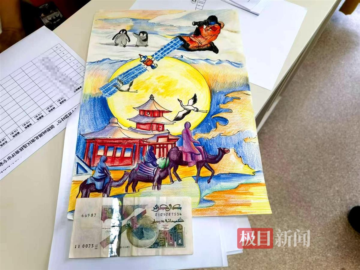 “今年6月底,杨子木跟妈妈商量好了主题,一个下午就画完了。”杨洪宽说,他们很喜欢孩子的作品。“北斗守望,丝路传情”的主题还有卫星的元素,跟杨子木妈妈李欣的经历有关:李欣是湖北省肿瘤医院的一名麻醉医生。2023年9月作为第28批中国(湖北)援阿尔及利亚医疗队的成员赴该国,开始为期2年的医疗援助任务。