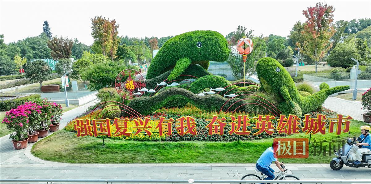 武汉市绿化服务中心养护科负责人万奕介绍,花瀑流淌出来的主角是超级凤仙,有多种颜色,再配以乒乓菊、国庆菊等色彩明丽的菊花迎接秋天,花瀑中点缀的一簇簇青草,名叫三菅兰、金边细叶芒;两颗爱心是由超级凤仙编织的,外围有向日葵、长春花、红枫、山茶等秋色植物,还有小叶女贞营造的“棒棒糖”造型,特别可爱,“当然,喜庆提神少不了三角梅!”