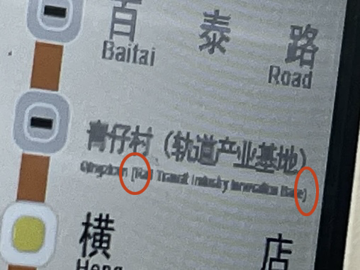网友:武汉地铁7号线青仔村(轨道产业基地)标点符号使用不统一,一边是中括号,一边是小括号。