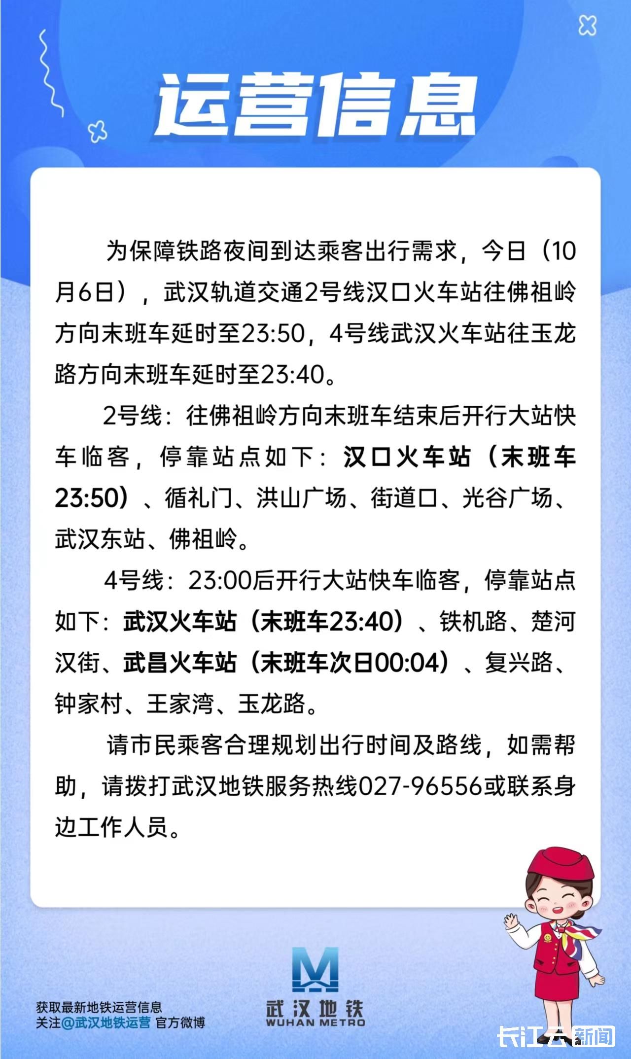 长江云新闻记者从武汉地铁运营公司获悉,为保障铁路夜间到达乘客出行需求,今日(10月6日),武汉轨道交通2号线汉口火车站往佛祖岭方向末班车延时至23:50,4号线武汉火车站往玉龙路方向末班车延时至23:40。