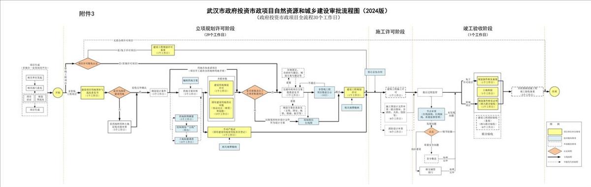 2024版武汉市自然资源和城乡建设审批流程图将社会投资房建、政府投资房建、政府投资市政三类工程建设项目的审批时间缩短至32、37、30个工作日,相较于机构改革之前,分别减少了41、50、24个工作日。