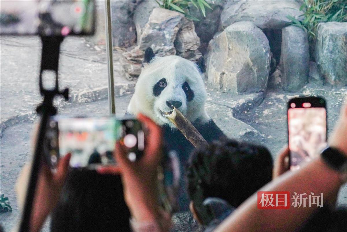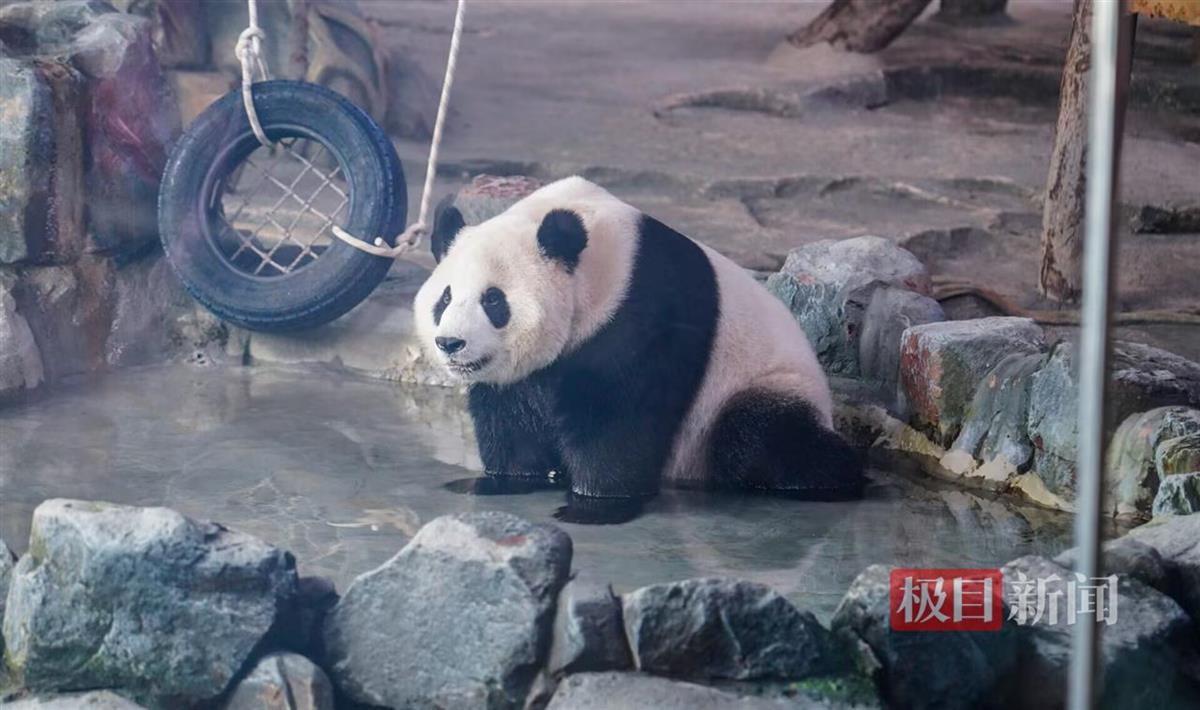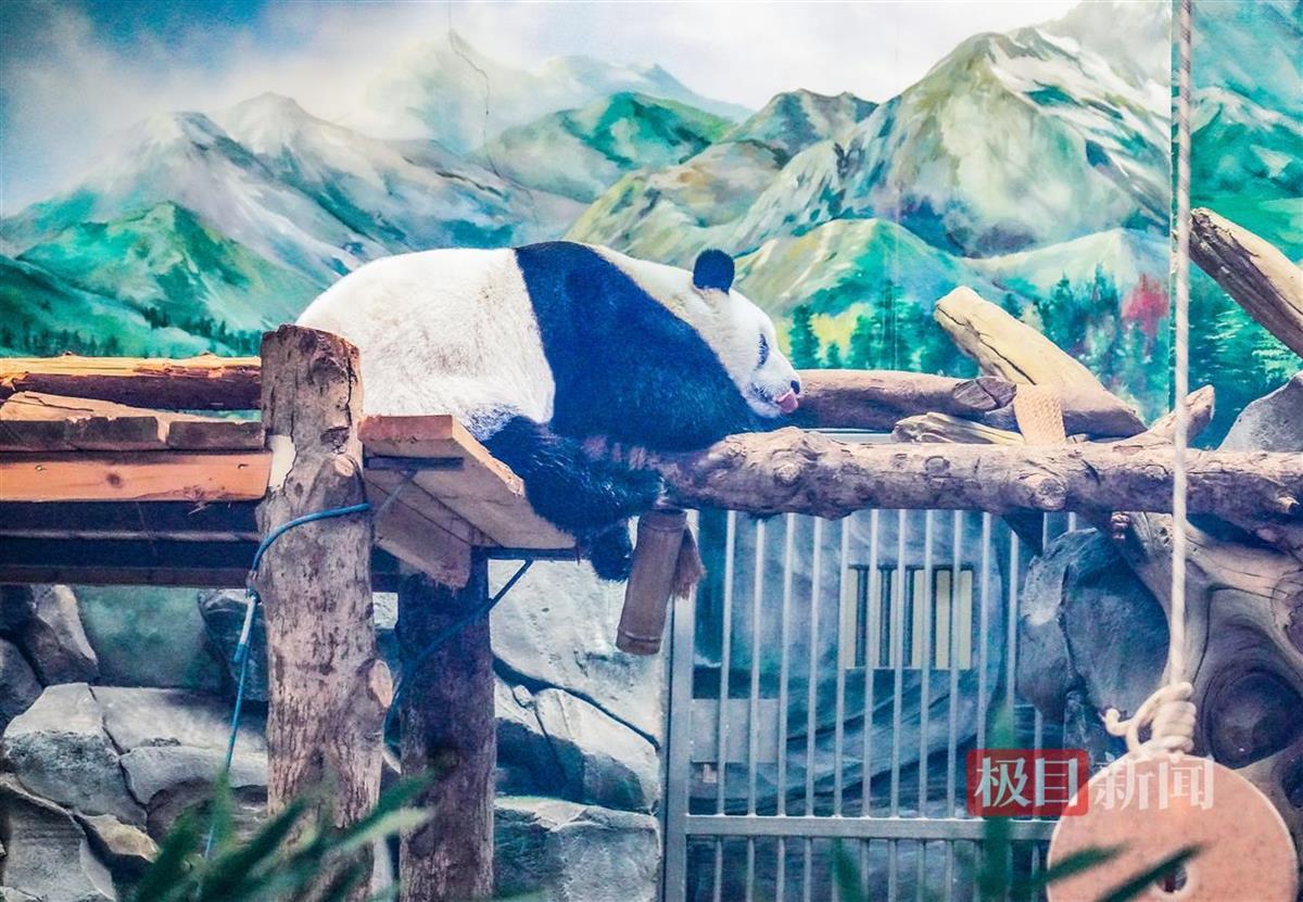 这么多游客前来给它道贺,它短暂玩了一下,就洗澡睡觉了,太有个性了吧?面对游客们的疑惑,曹骏解释道:“它确实有个性,加之‘假孕’状态,目前就是油盐不进,很叛逆。比如,上周它有3个晚上,不回内室睡觉,就在户外凉棚里吹着凉风、闻着桂花香睡觉,在外玩一天,喊她好几次回内室,它就是不回,半夜还得多次起来看它的状态,而且吃得也少,你喊她吃饭吧,它装作没听见,给它好吃好喝的吧,它也不理睬,它自己在户外扯竹子吃,不过它还是知道吃热量高的窝窝头,总之,现在它就是怎么舒服怎么来!我们简直把它没得办法啊!它在户外睡觉,也与它小时候在四川处于放养状态有关,它在四川也经常在户外睡觉。”