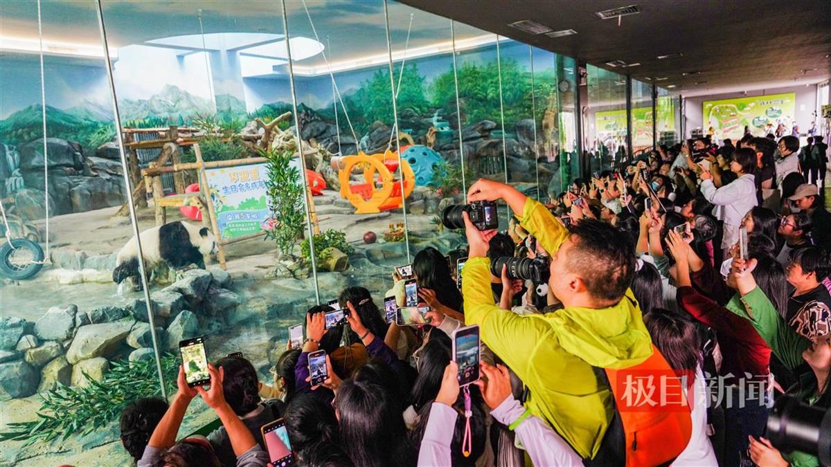 上午9时许,很多游客已提前来到大熊猫馆内展厅,即便是工作日,游客也很多,济济一堂,感受国宝的生日宴气氛。