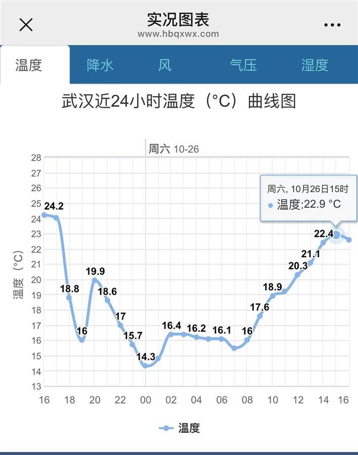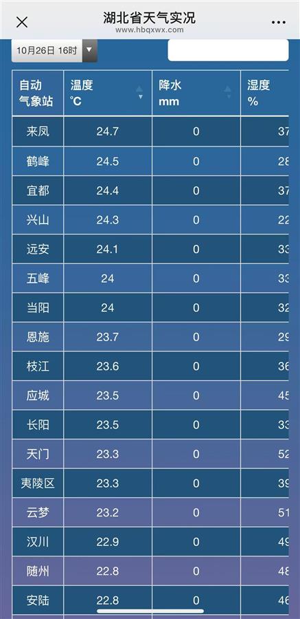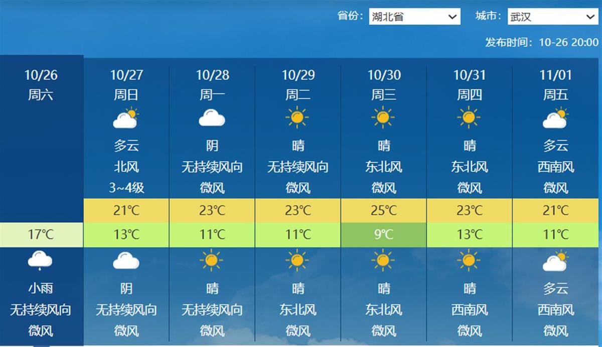 昨日(10月26日)午后,在武汉还可穿短袖,因为武汉最高气温在24-27℃。