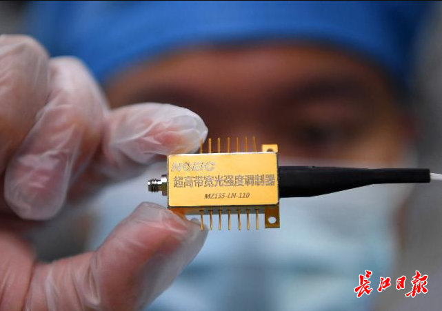 国家信息光电子创新中心,工程师展示国内首款110GHz电光强度调制器,该产品核心芯片和零部件已全部国产化。 长江日报记者高勇 摄