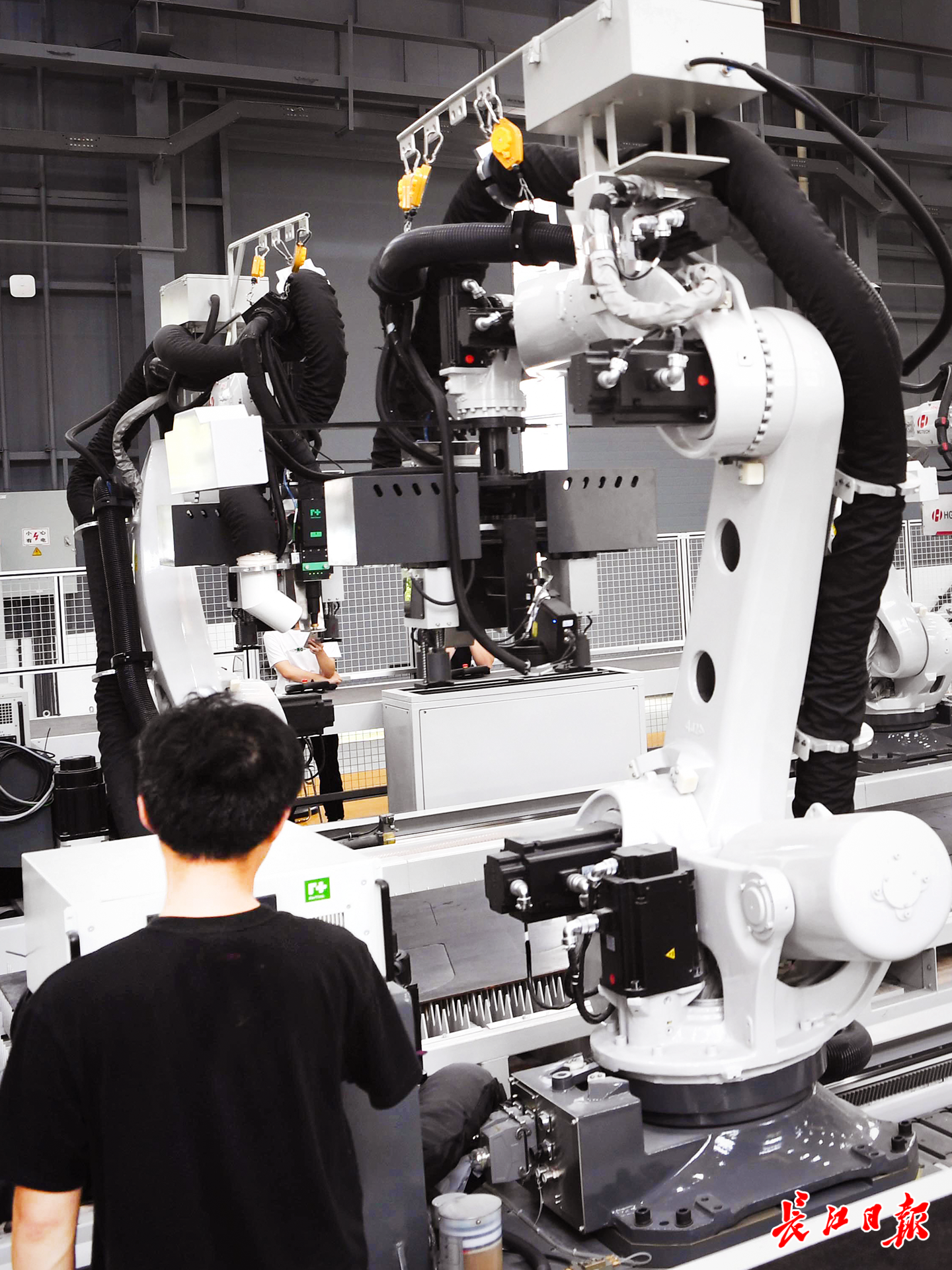 华工科技中央研究院中试基地,巨大的机器人手灵巧地抓取钢板进行激光切割。