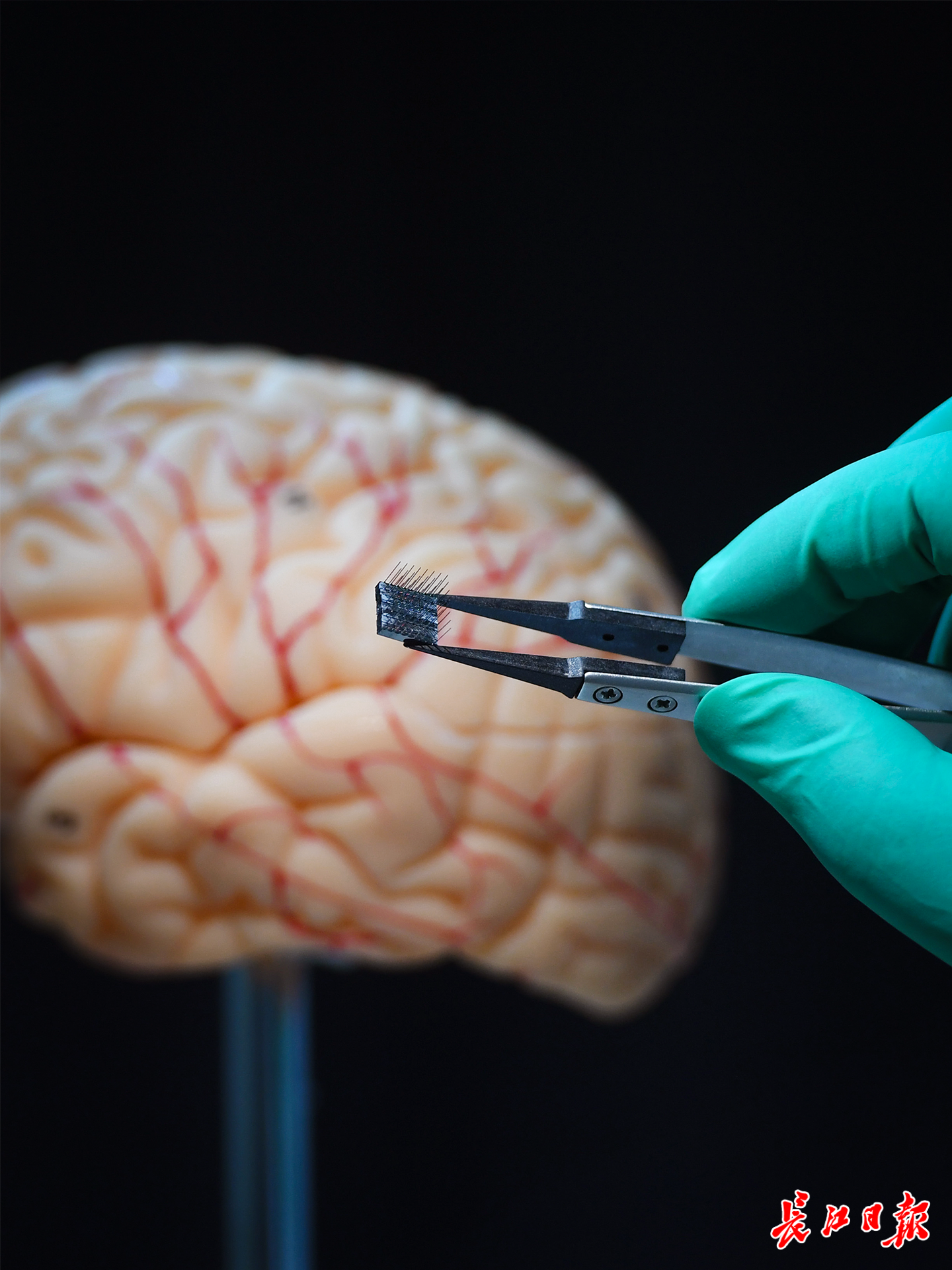 武汉衷华脑机融合科技发展有限公司,科研人员展示一枚双向植入式脑机接口系统微针阵列。