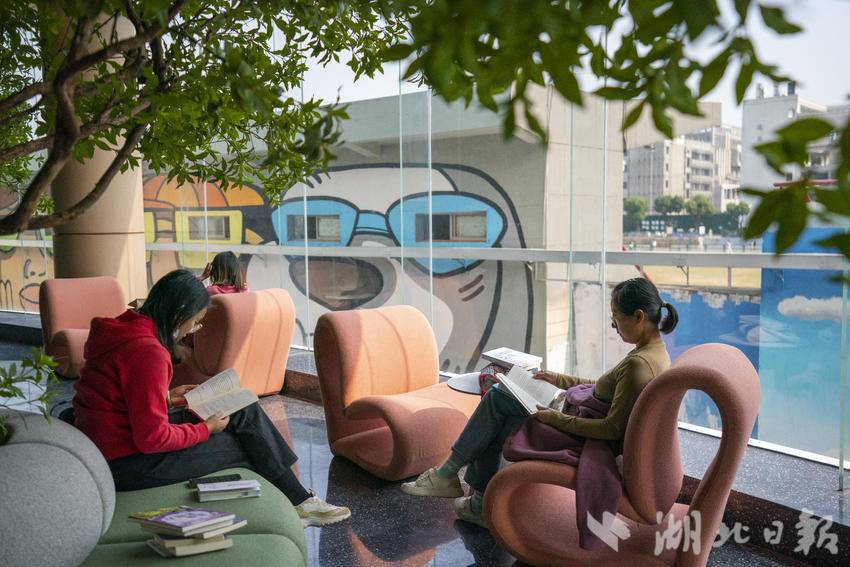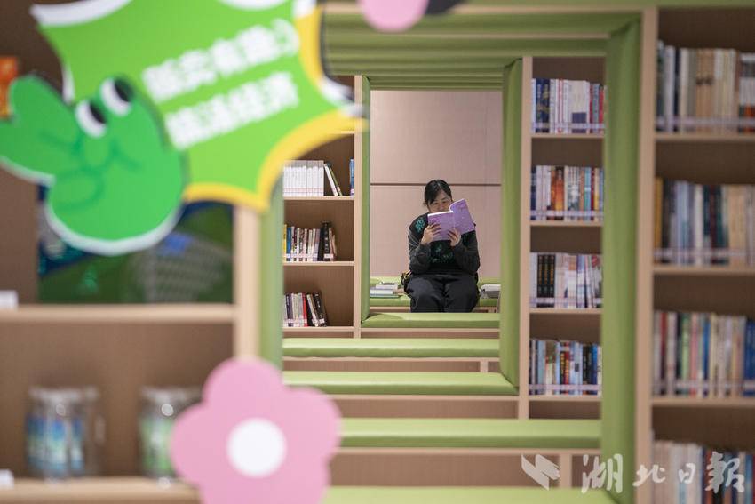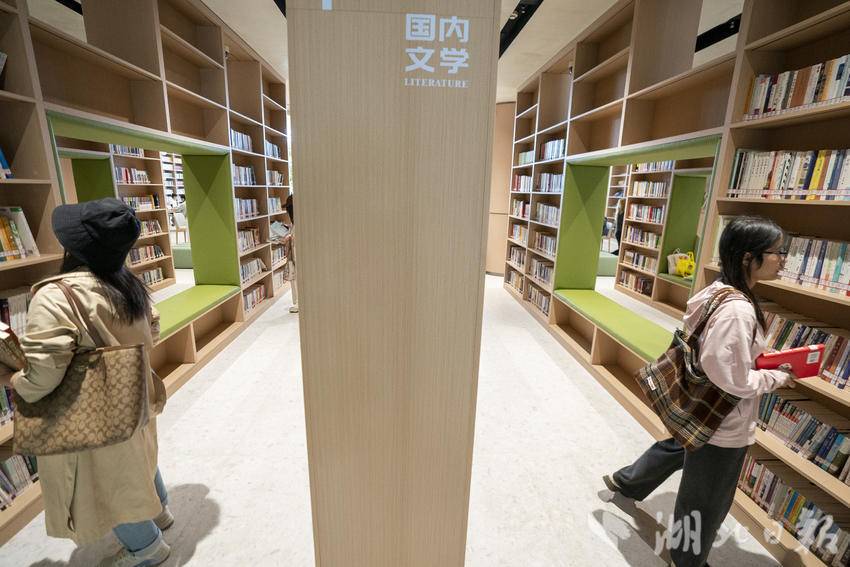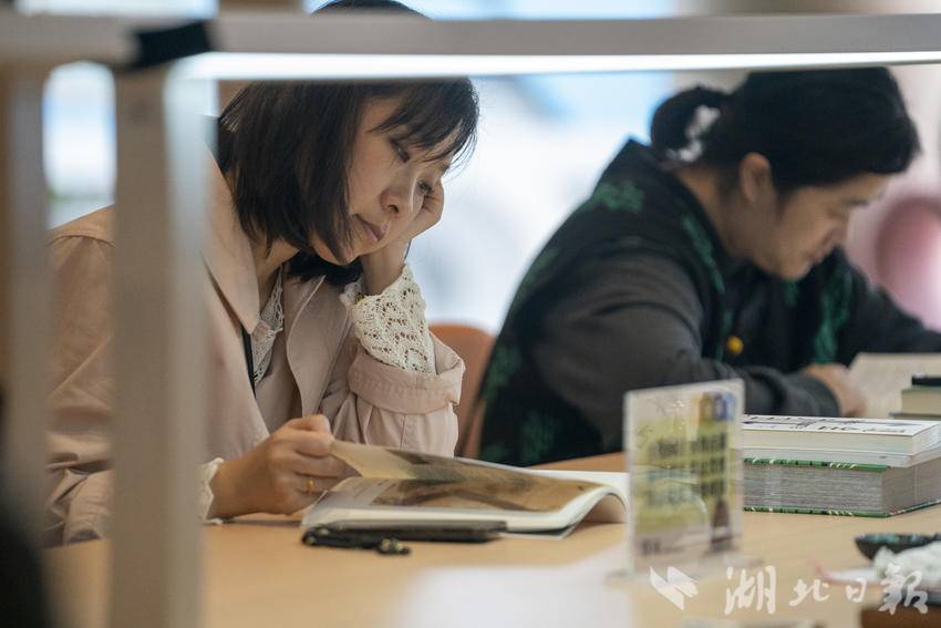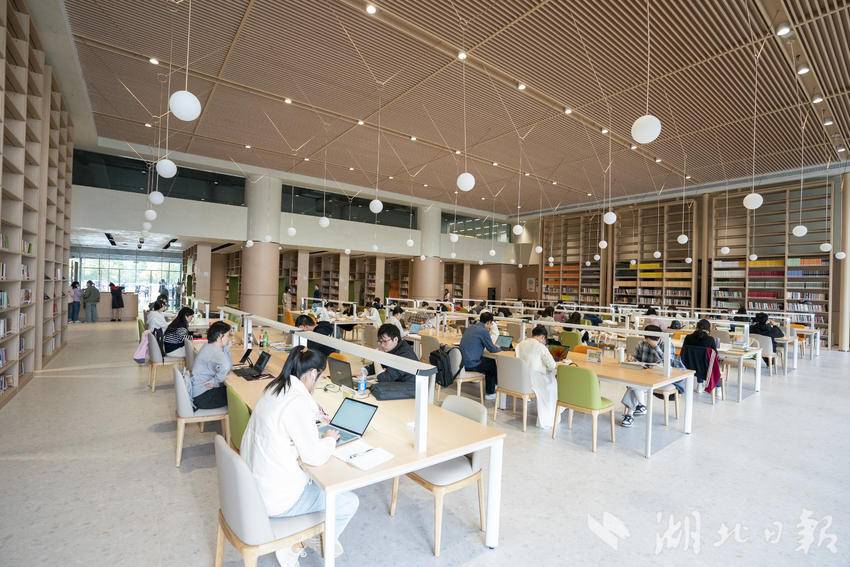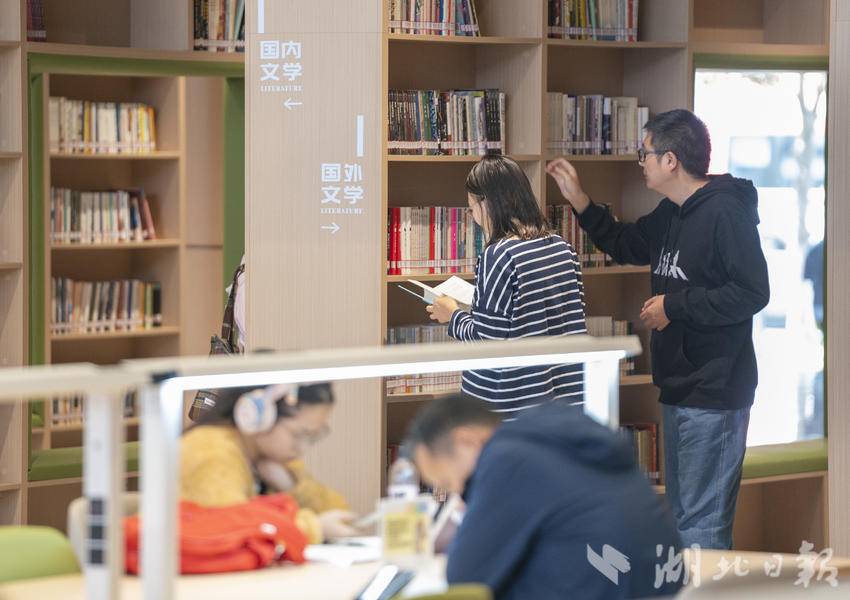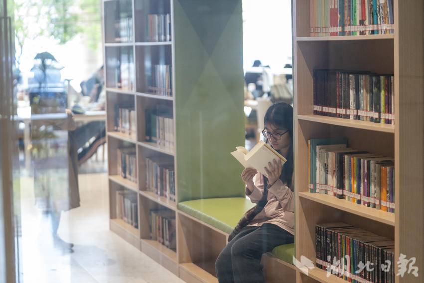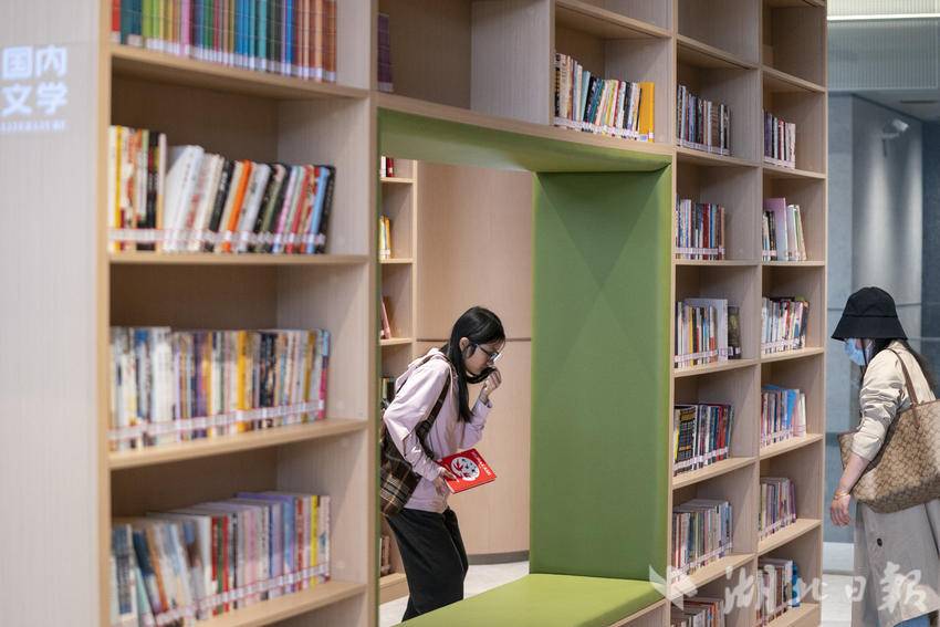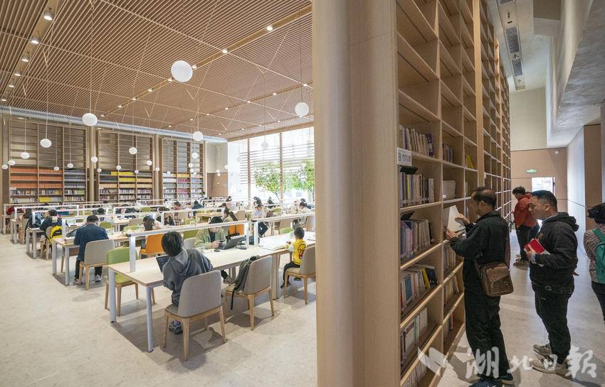 11月5日,光谷创意产业基地B座一层的光谷书房分馆,市民读者井然有序地阅读、借书。近日,第8家光谷书房——光谷书房·创意产业基地分馆正式对外开放。新分馆藏书4万册,面积近1000平方米,可容纳300人同时落座,是目前面积最大、藏书最多的光谷书房。分馆设置了中央阅读区、树下阅读区、儿童阅读区等各种风格的主题区。馆内设计以“温暖舒适的社交与学习空间”为核心,布置高达9米的落地玻璃,加入绿植、木材等自然元素,让阳光洒入绿色书房,营造宁静与舒适的氛围。2022年4月至今,武汉东湖高新区已陆续建成8家光谷书房,累计接待读者总人次近百万、借还书量达147万册。 (湖北日报全媒记者 魏铼 摄)