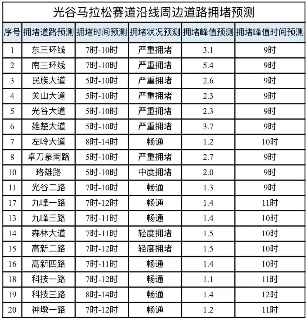 光谷马拉松赛道沿线周边道路拥堵情况预测表