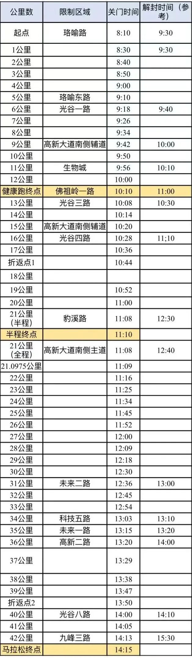 2024光谷马拉松各公里点关门时间和开放限制时间参考表