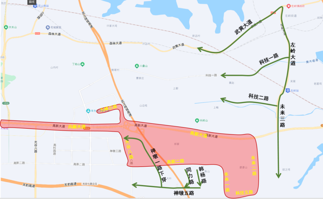 绕行路段:通行以上管制路段车辆请绕行未来三路、左岭大道、科技二路、科技一路、武黄大道通行。