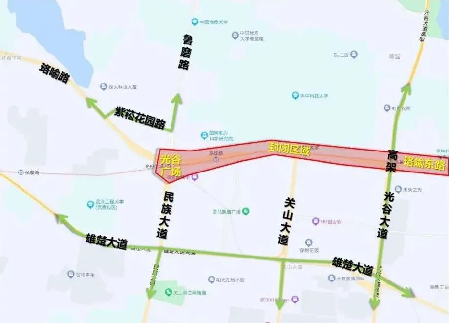 绕行路段:需通行以上管制路段前往光谷转盘方向车辆请绕行喻家湖路、光谷高架、雄楚高架、雄楚大道、紫菘花园路、邮科园路、卓刀泉南路。