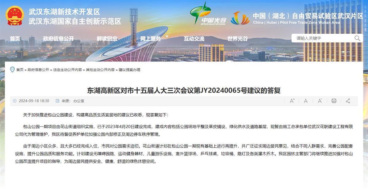 今年9月18日,武汉东湖新技术开发区政务网发布了《东湖高新区对市十五届人大三次会议第JY20240065号建议的答复》。该答复介绍,包山公园一期项目由花山街道组织实施,已于2023年4月20日建设完成,建成内容包括公园场地平整及草皮铺设、绿化供水及道路基层,现暂由施工总承包单位武汉花联建设工程有限公司代为管理维护,该区将督促养护单位加强公园内部修正及周边停车秩序管理。