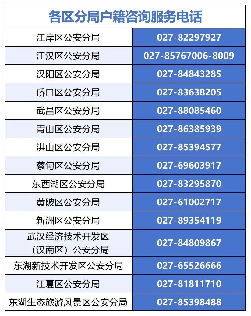 各区户政部门业务咨询电话