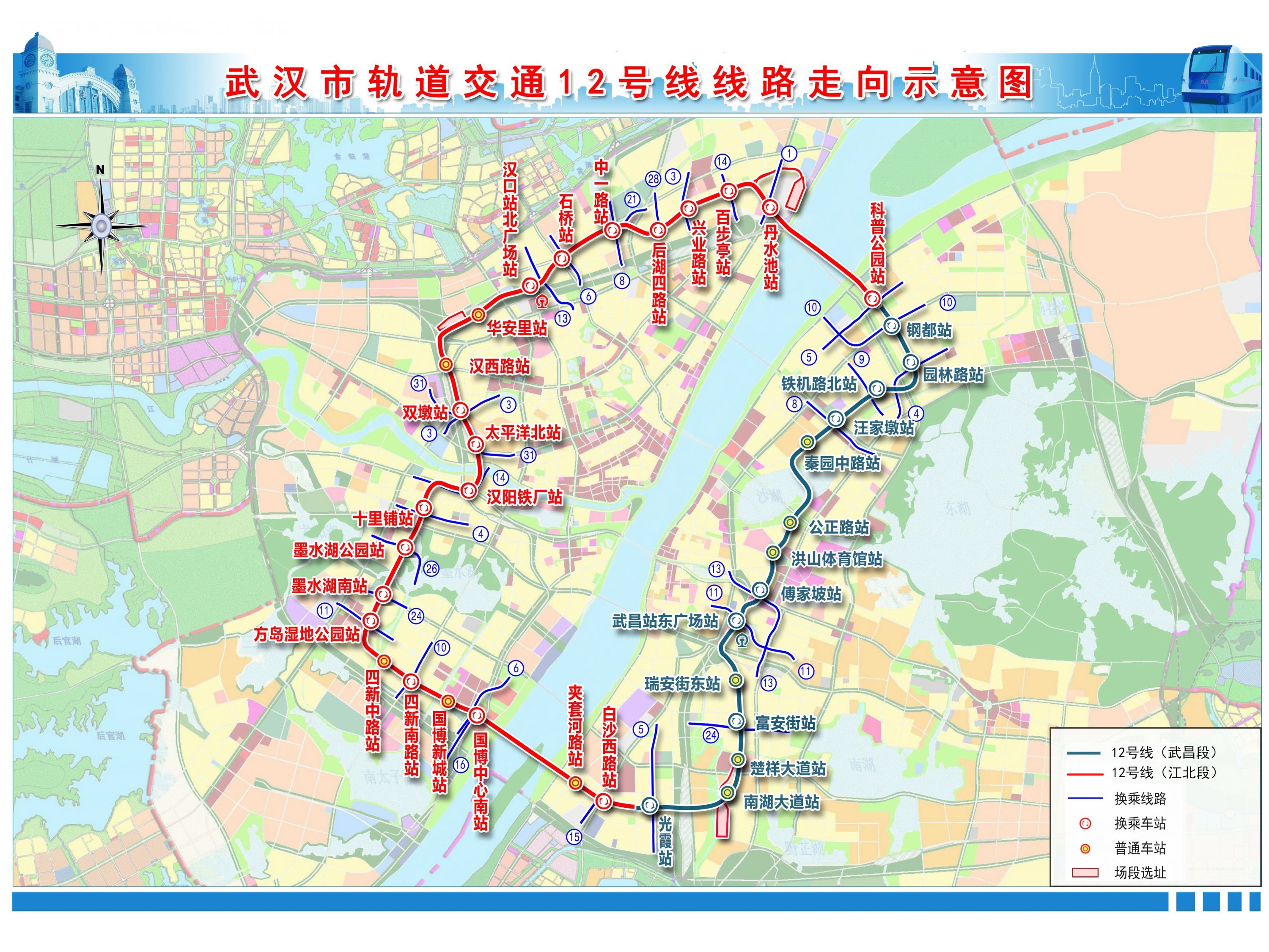 武汉轨道交通12号线工程是武汉市轨道交通线网中唯一的环线,连通武汉三镇,串联硚口、江汉、江岸、青山、洪山、武昌及汉阳共7个行政区域。线路全长59.9km,全为地下线路,设站37座,车站拟定站名如下: