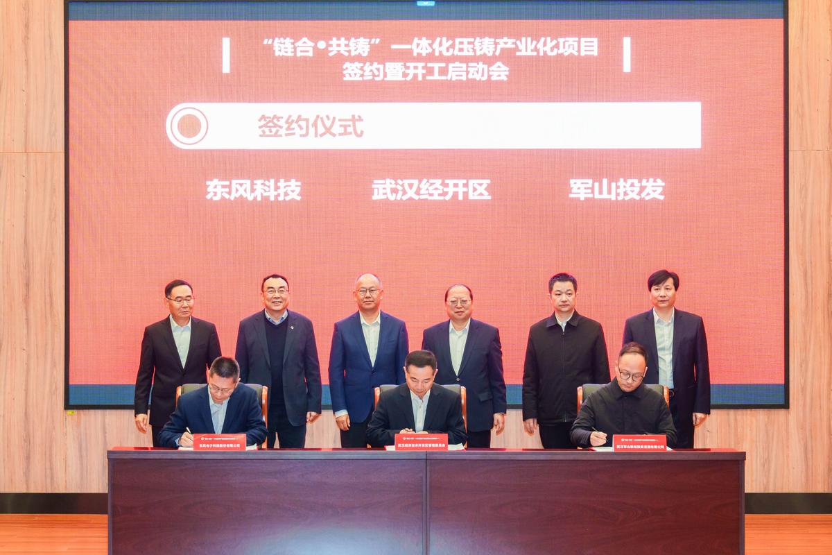 当天,武汉经开区、东风科技、军山投发签署投资协议。东风科技将根据东风汽车统筹规划,分期建设压铸产线,一期建成10000吨、16000吨两条压铸产线,全年产能20万件,2026年投产。武汉经开区、军山投发将为东风一体化压铸产业化项目的投资、建设、运营全生命周期提供必要的便利条件,做好相关服务,特别是在产业创新、产业链协同、对接产业资源等方面,积极帮助东风科技争取各种政策,促进项目做大做强,为区域经济转型发展作出更大贡献。