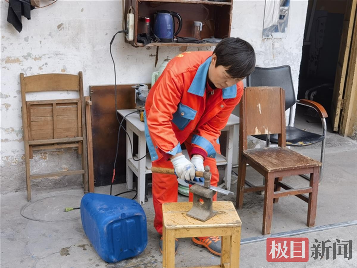 “我要做几个大号撮箕,以备同事不时之需。”刘燕萍说着,拿起一个捡回的蓝色塑料桶,用切割机将顶部切开,然后将其切成撮箕形状。随后,她将从路边捡回的一根铝合金条,切下约20厘米,用铆钉钉在撮箕口底部,将其牢牢包裹住。