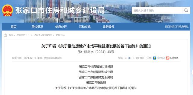 12月17日,河北省张家口市住房和城乡建设局等四部门联合发布关于印发《关于推动房地产市场平稳健康发展的若干措施》的通知。
