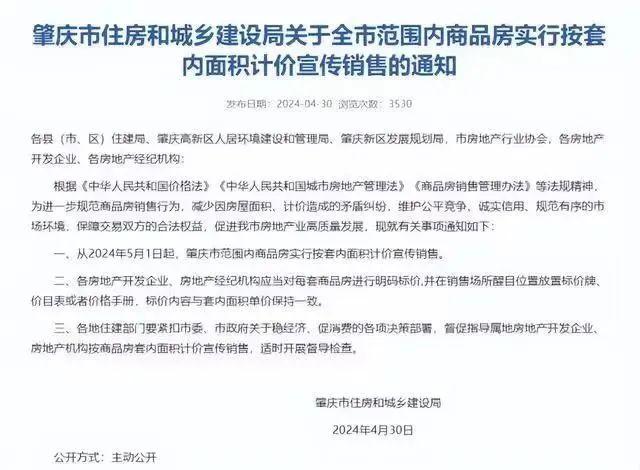 此前,广东省肇庆市率先发布商品房实行按套内面积计价的通知。