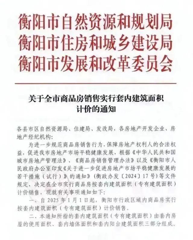 据此前报道,12月12日,衡阳市自然资源和规划局、衡阳市住房和城乡建设局、衡阳市发展和改革委员会联合发布《关于全市商品房销售实行套内建筑面积计价的通知》。明确自2025年1月1日起,衡阳市商品房销售实行套内建筑面积计价。