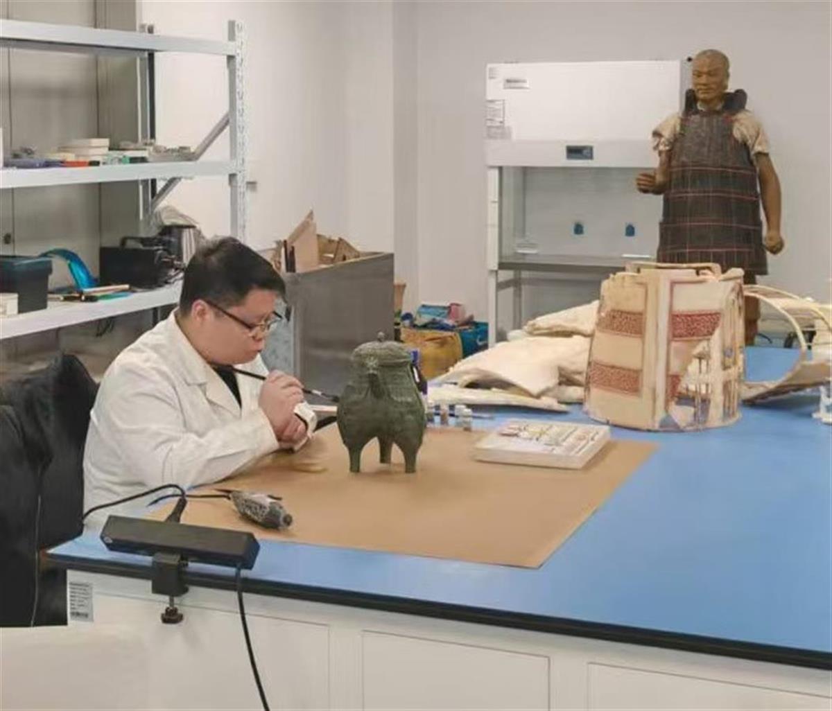 展示现场,方晨面对高大厚重的编钟,眉头紧锁,他小心翼翼地用低温锡焊连接残片,汗水顺着他的脸颊滑落,他全神贯注,只为让这古老文物重现辉煌。他身穿一件白色的工作服,袖口随意地挽起,手持笔刷轻轻地在文物表面勾勒着,特制的颜料在他灵巧的手指间跳跃。有时,他会手持电轮在3D打印的文物部件上打磨;有时,他又会用毛笔轻拂,让色彩在文物上自然过渡。在讲述修复文物工作时,方晨的脸上洋溢着自豪的笑容,那是对艺术的热爱,对历史的敬畏,更是对自己精湛技艺的自信。