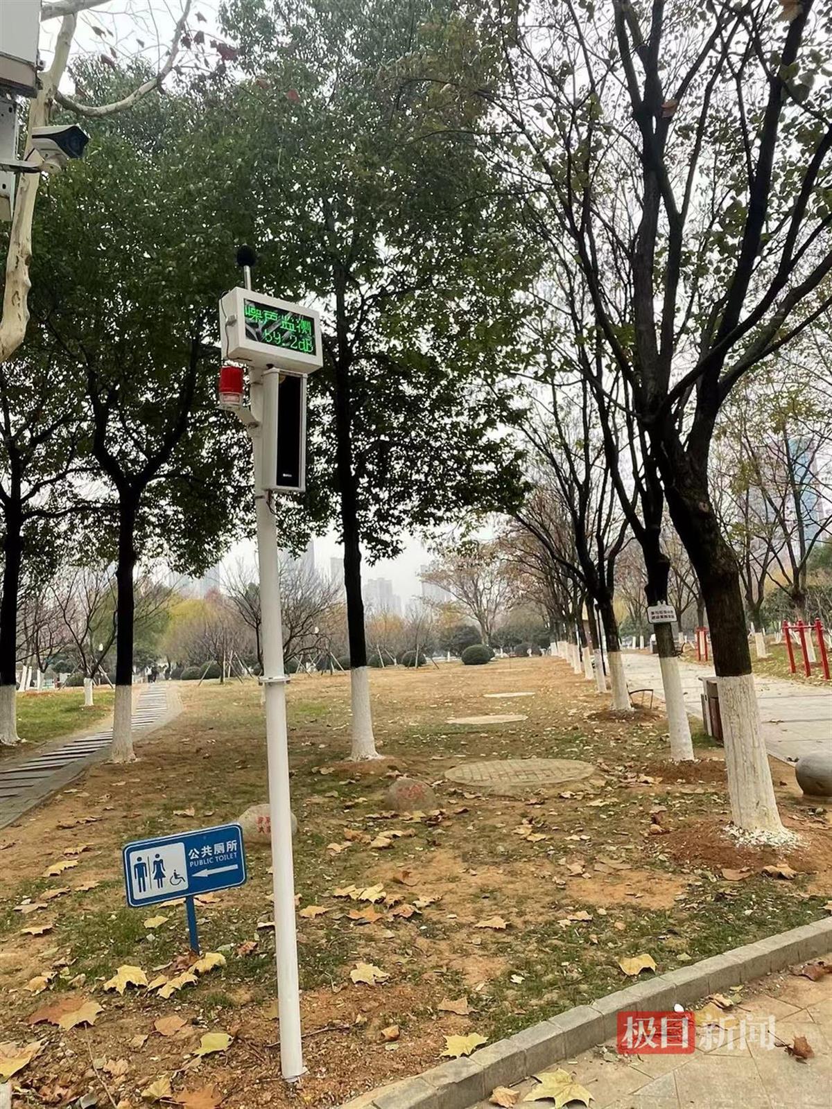 “您的音量已超标,请降低音量!”今日(4日)上午,极目新闻记者路过武汉关山公园时,一群小男孩疯闹着玩,大笑了一声,站在路边的噪音监测仪就开始温馨广播了,重复了三次,同时显示屏显示噪音分贝超100了,显示屏也变红了。
