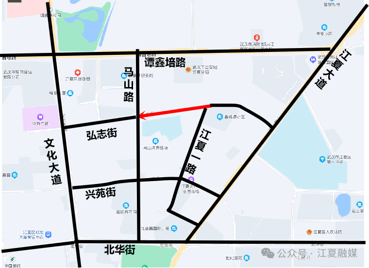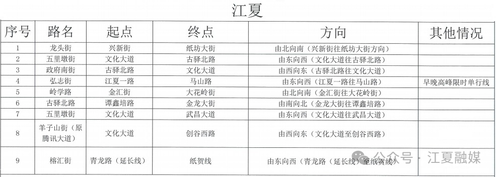 弘志街(江夏一路→马山路)由东向西单行早晚高峰限时单行