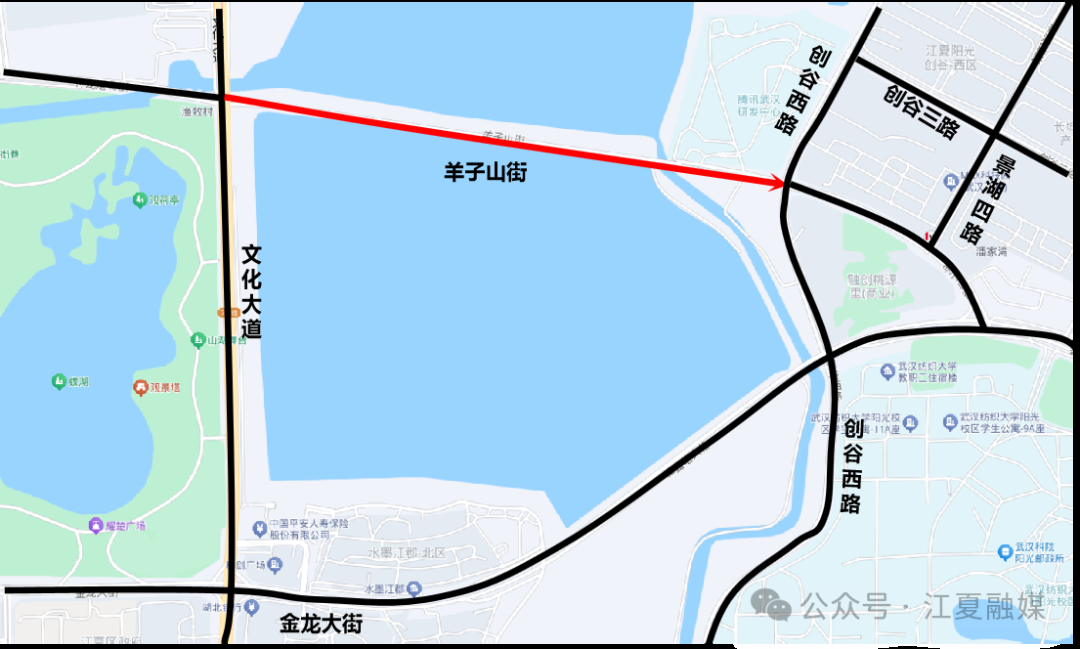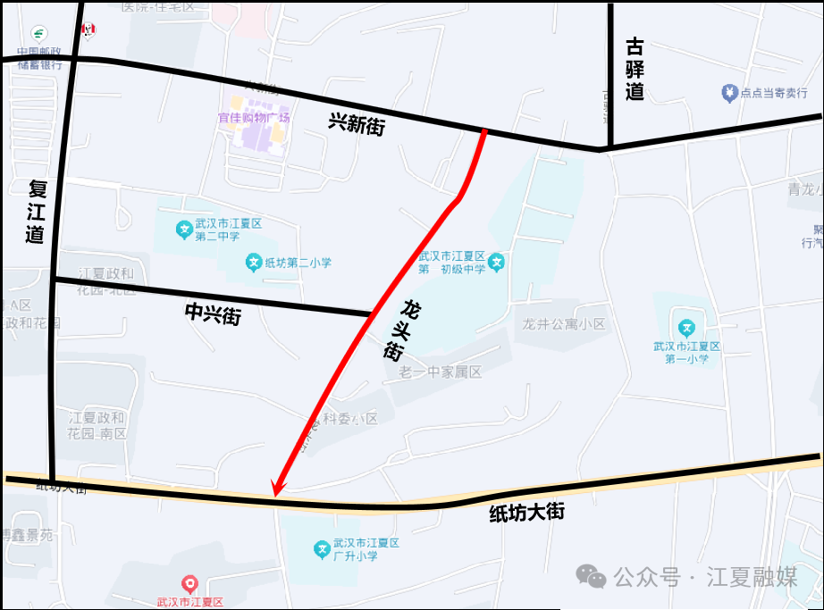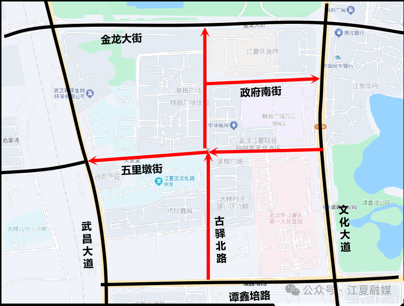 五里墩街(文化大道→古驿北路)由东向西单行政府南街(古驿北路→文化大道)由西向东单行古驿北路(谭鑫培路→金龙大街)由南向北单行五里墩街(文化大道→武昌大道)由东向西单行