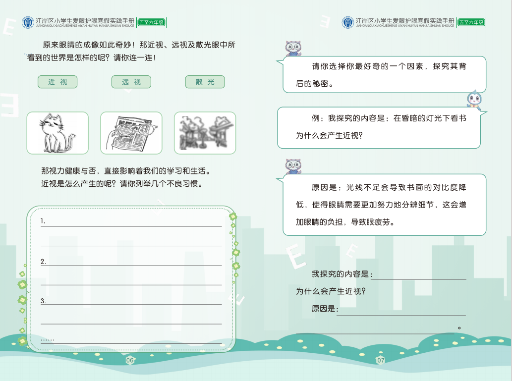 《明眸奇遇记——江岸区小学生爱眼护眼寒假实践手册》,通过探究性自主学习,以视力健康这个话题为载体,让学生在亲历研究性学习的过程中,促进综合学习能力的提升。