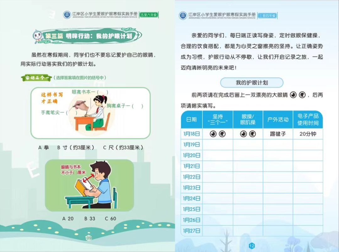 目前,长春街第二小学、四唯路小学、育才华岭小学、育才家园小学等学校已经开始向学生发放该手册,江岸区所有小学生在寒假前都会收到这本护眼秘籍。