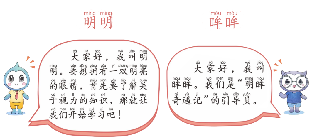 手册开篇以“明明”和“眸眸”两个小卡通人物作为“探秘小导游”,引领孩子们走进“明眸档案——了解我的视力”“明眸探秘——解锁视力健康密码”“明眸行动——我的护眼计划”三个篇章。