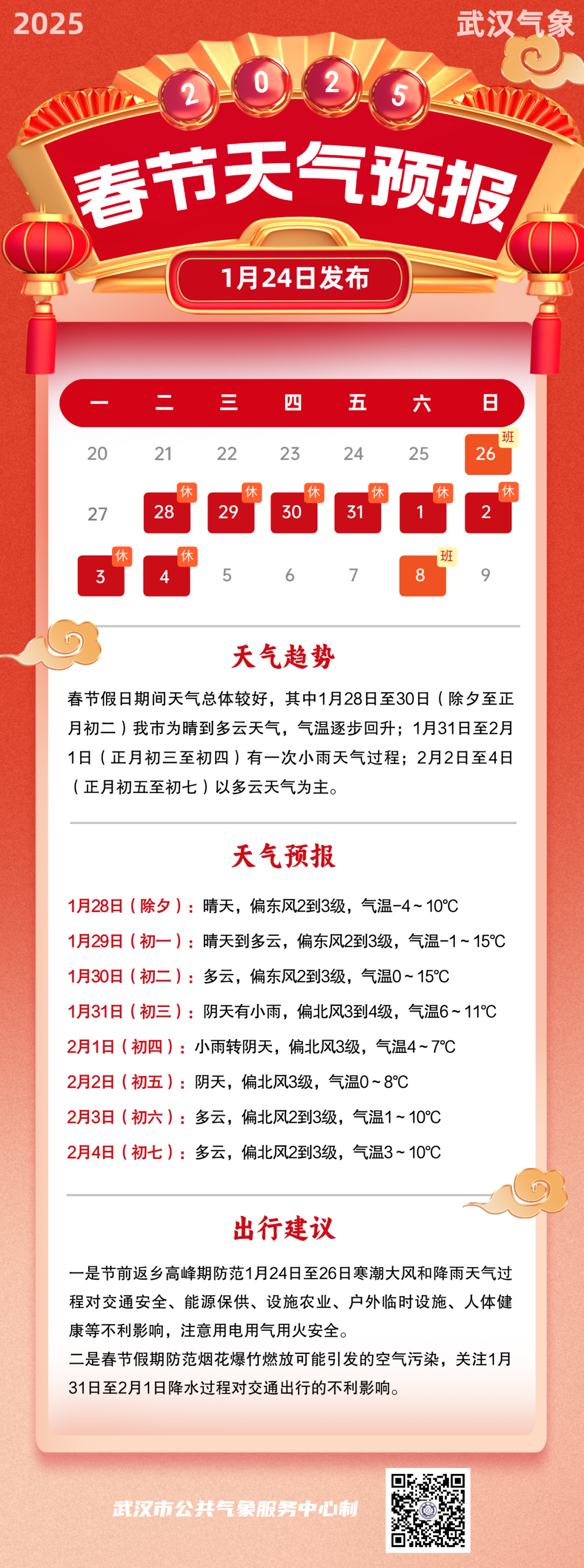 武汉春节天气已出炉!今天(1月24日)至26日,武汉有寒潮大风和降雨天气,春节假期天气总体较好,31日(大年初三)前后有降水。