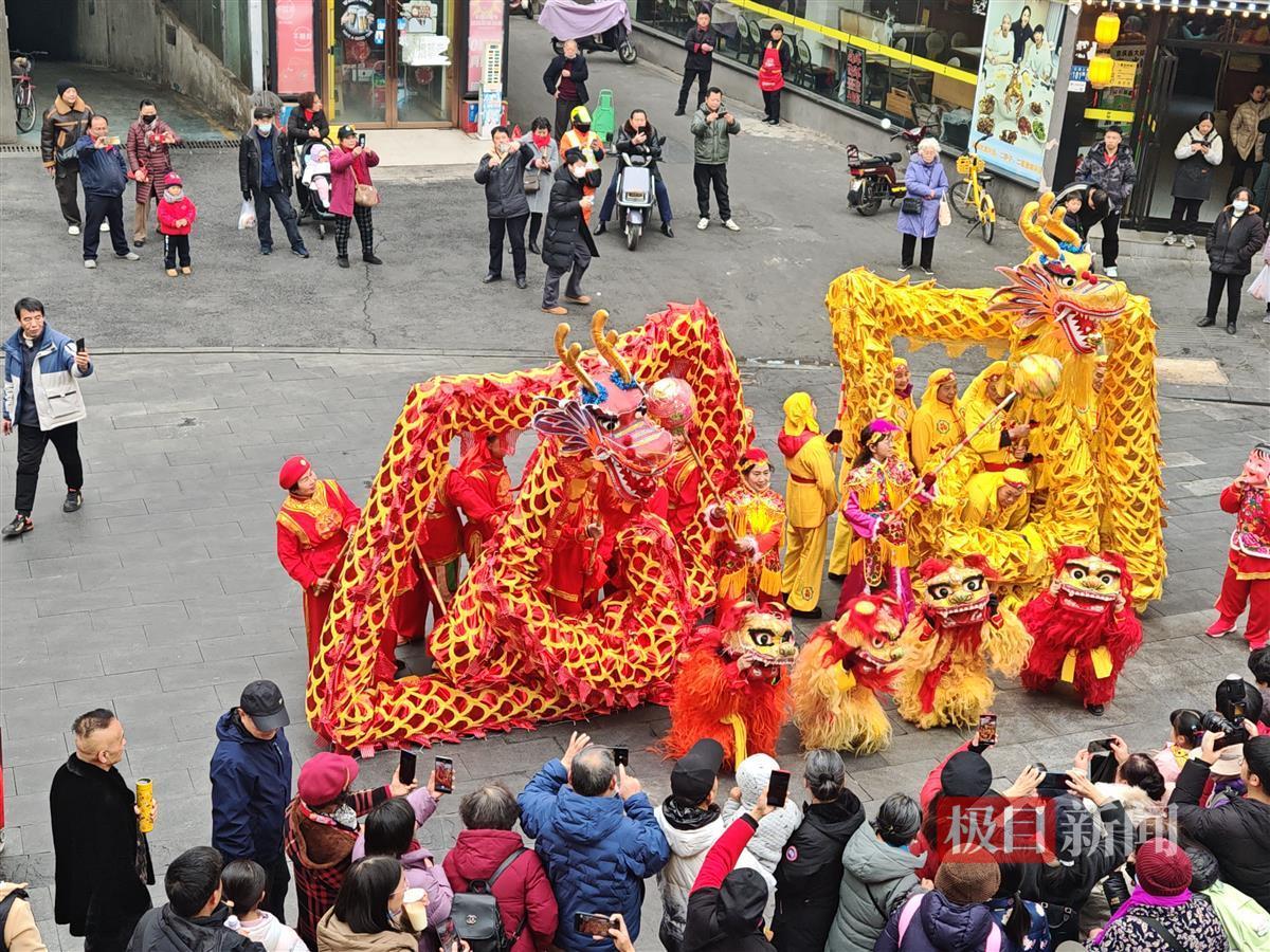 2月12日上午,在武汉市江岸区吉庆民俗街里,铿锵有力的鼓声响起,两条“巨龙”腾空而起,上下翻飞、变幻万千。舞龙队精彩的表演拉开了2025“年味武汉 非遗贺新春”系列民俗文化活动——正月十五“龙腾鼓跃”闹元宵活动的序幕。