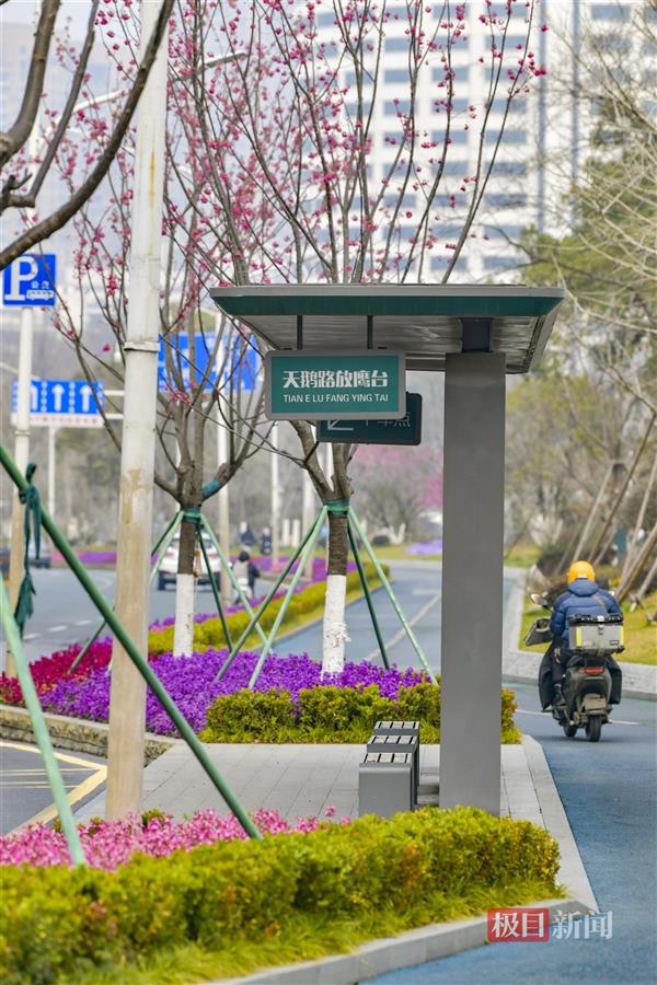 等车、上车、下车,送你一树红樱花,这是武汉朋友们在公交站台就能独享的浪漫。