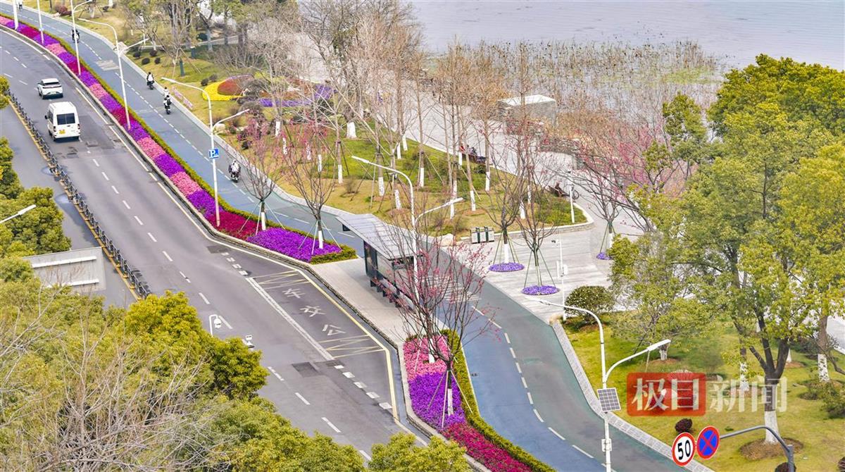 8棵樱花树并不孤单,公交站台两侧的绿化带里,红、粉、紫这3种暖色调的紫罗兰,热情洋溢地充当气氛组,传递温暖、愉悦身心。