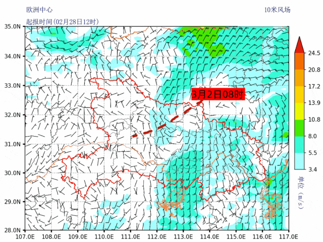 2日08时-3日08时,鄂西北、鄂西南阴天有中到大雨,局地暴雨,夜间西部高山地区有雨夹雪或雪;江汉平原北部阴天有小到中雨;其他地区多云转中到大雨,局地暴雨。省内大部分地区伴有雷电、局地强对流。最高气温鄂西北13~16℃、鄂东南24~30℃、其他地区17~23℃,最低气温北部1~4℃、南部4~8℃,偏北风3到5级、阵风7到9级。