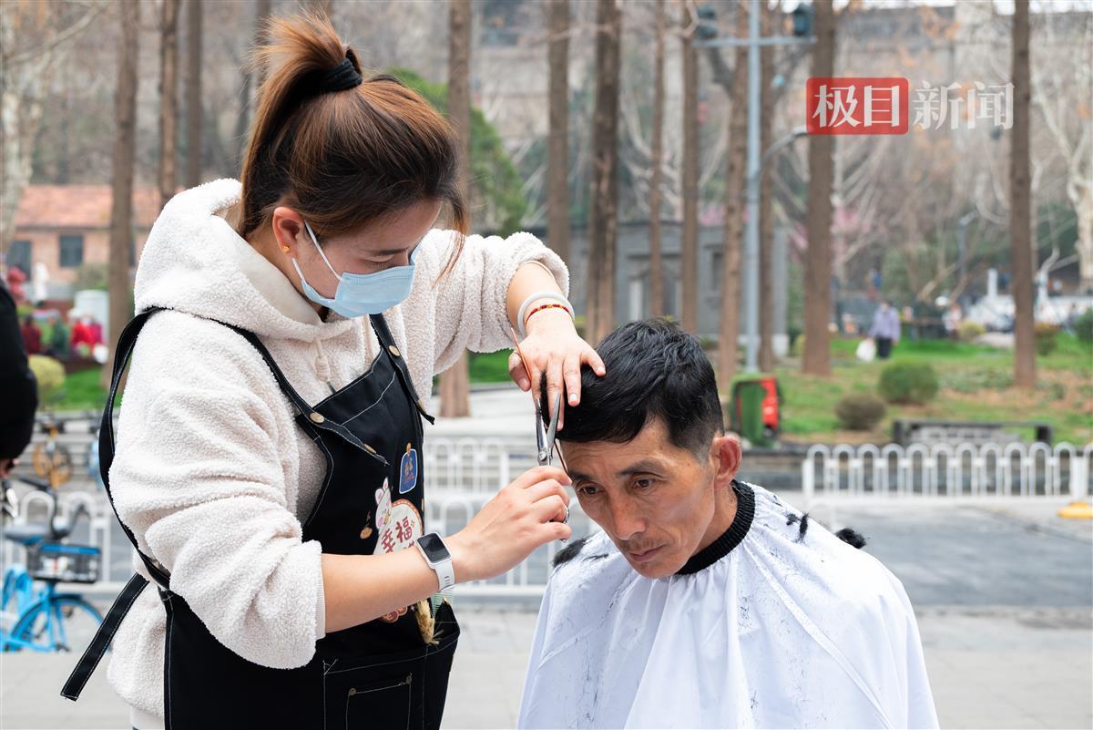 3月1日上午10时,位于武昌区汉阳门花园对面的萧栋栋广场上人头攒动,热闹非凡。一字排开的理发椅前,环卫工人和社区居民有序排队等候。来自林莉苹发型工作室和经典美发培训学校的“托尼”老师们,手持剪刀、梳子,熟练地为每一位前来理发的市民修剪发型。