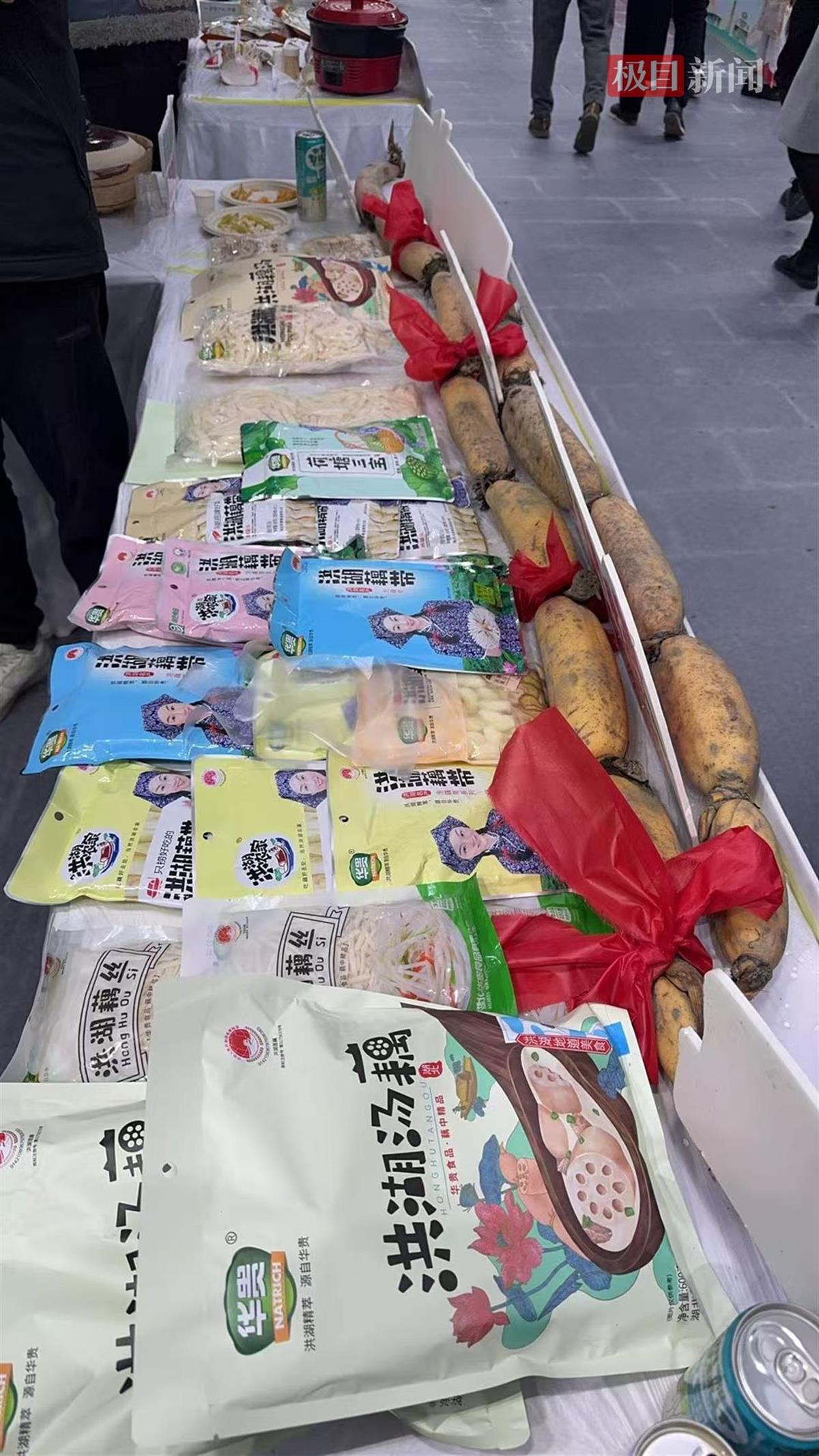 在展台上,极目新闻记者看到,华贵食品厂家带来了藕片、藕丸、藕条等系列藕制品,还有洪湖野莲汁、洪湖野藕汁等系列饮品,不少市民排队品尝、购买。
