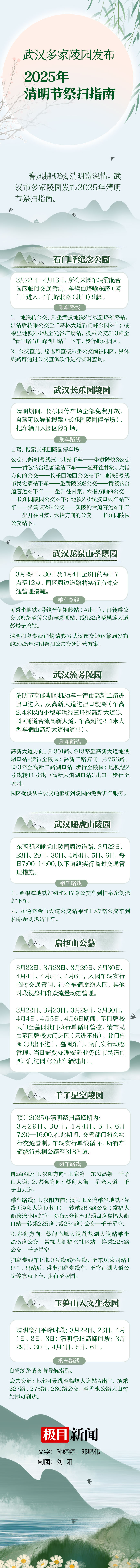 春风拂柳绿,清明寄深情。极目新闻记者获悉,武汉市多家陵园发布2025年清明节祭扫指南,涵盖交通出行、停车安排、便民措施等各项服务内容,有的陵园为便于市民出行,提供免费摆渡车服务。截至3月21日记者发稿时,武汉市八家陵园公布了陵园清明祭扫指南,内容如下: