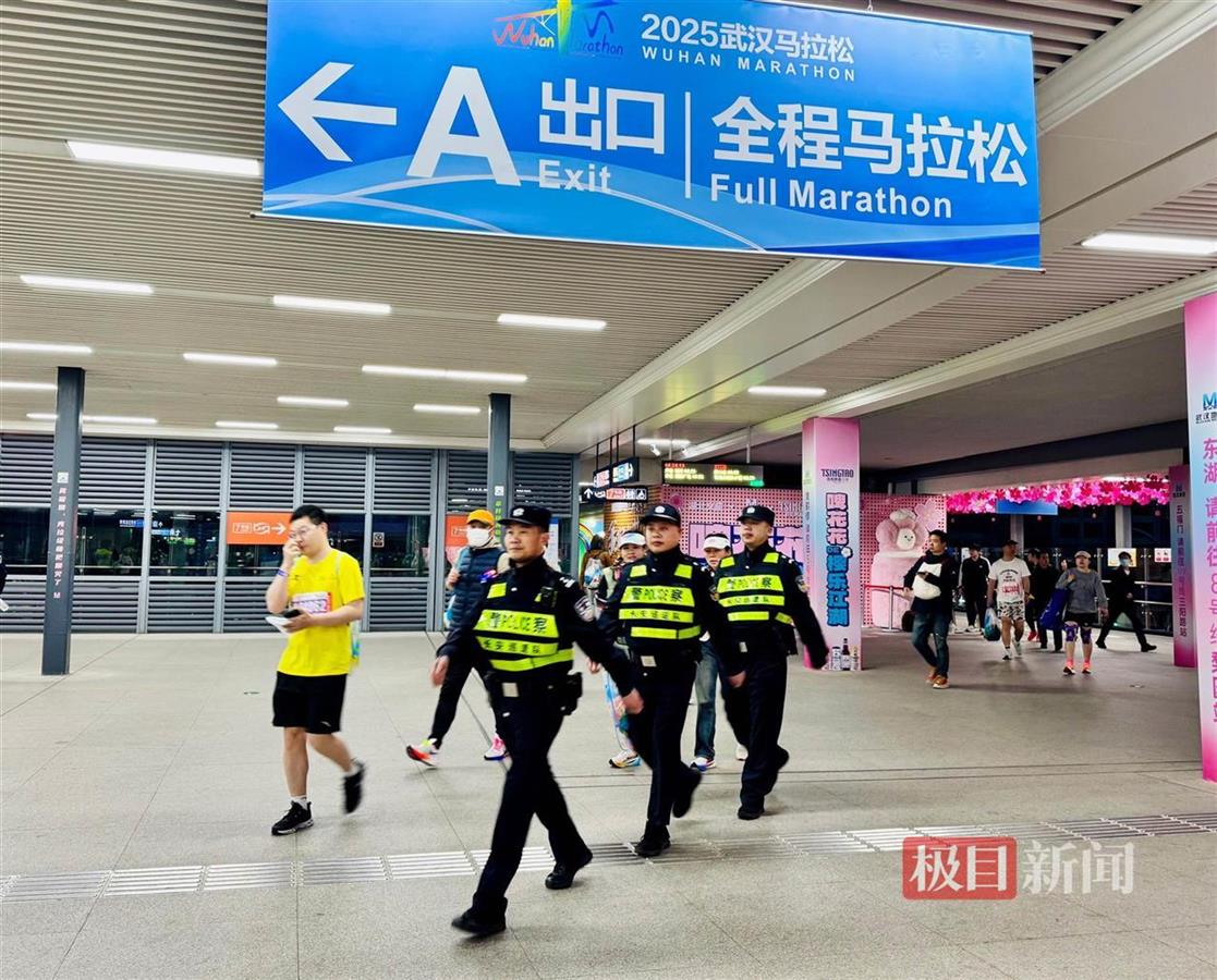 武汉地铁7号线三阳路站是距离汉马起点最近的地铁站。清晨6时30分,三阳路站内乘客往来穿梭,喧嚣声、播报声此起彼伏。警灯闪烁之处,轨道交通管理分局长安巡逻队正在执勤。不少跑友找到民警吴长安询问出站方向,吴长安耐心细致地一一解答。