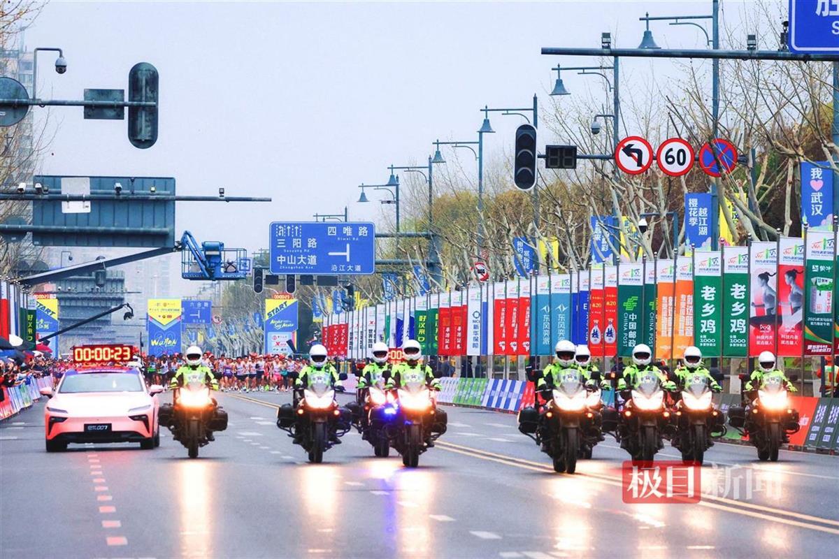 7时30分,全程马拉松比赛鸣枪开跑。9名汉警快骑队员驾驶警用摩托,呈箭形方阵行驶在最前方,为跑者全程开道护航。