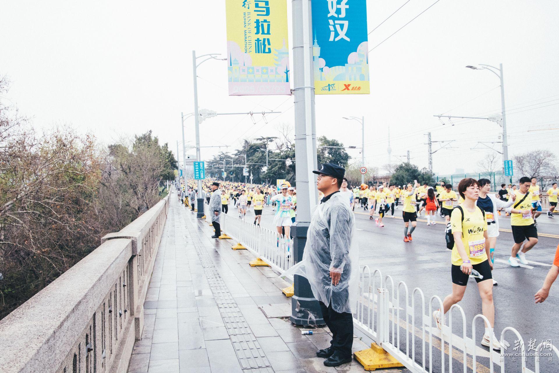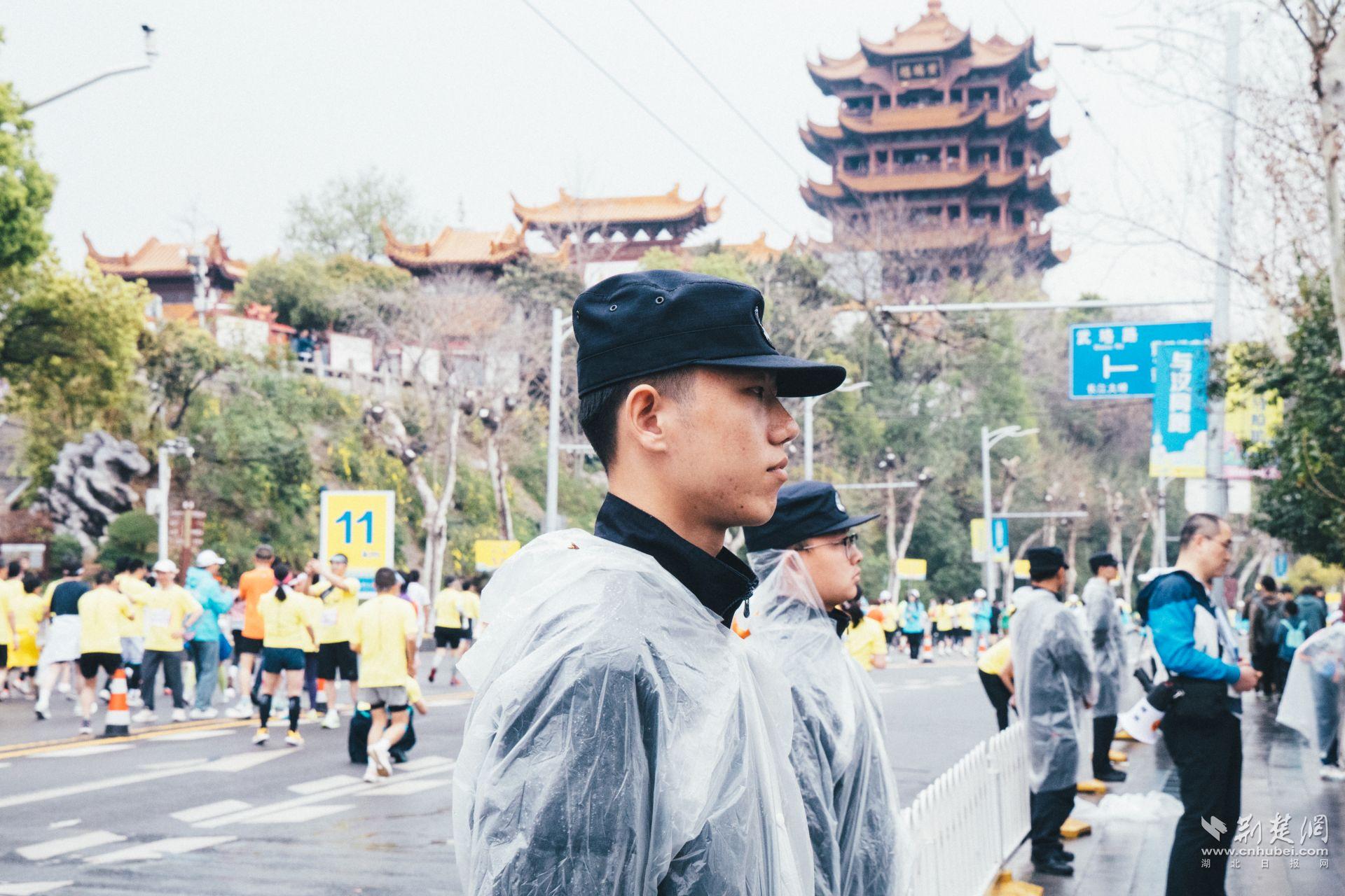 从起点沿江大道三阳路口,到现代化气息浓郁的长江大桥、楚河汉街赛段,到充满历史韵味的黄鹤楼赛段,到风景秀丽的东湖绿道赛段,再到终点欢乐谷广场等,都能看到他们挺拔的身姿。他们身着整齐制服,精神抖擞,按照分区管理方式,对武昌段、汉口段共十个责任段的执勤点进行值守。