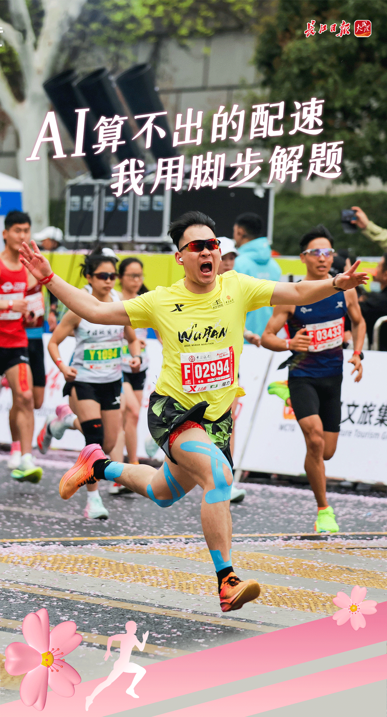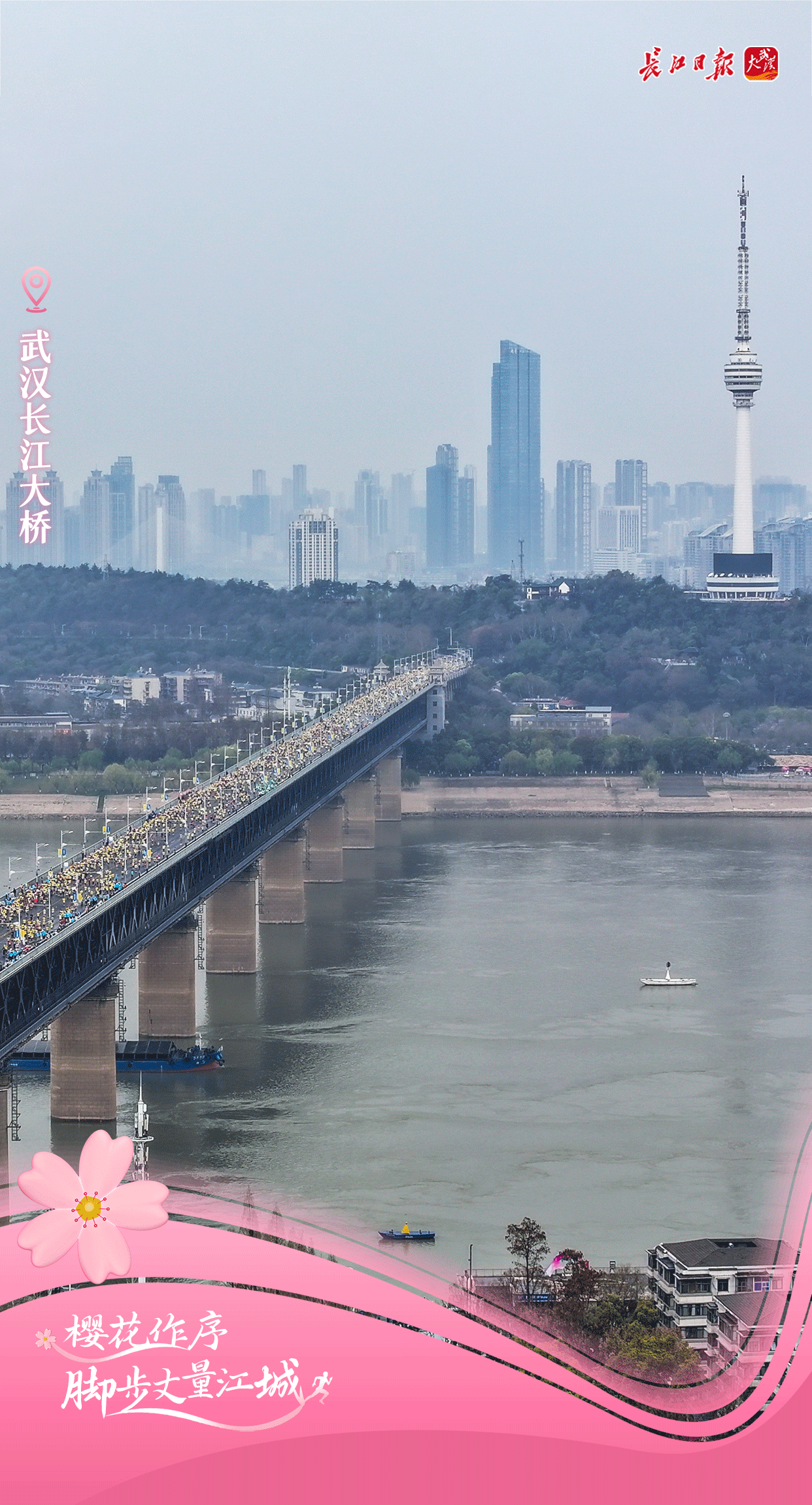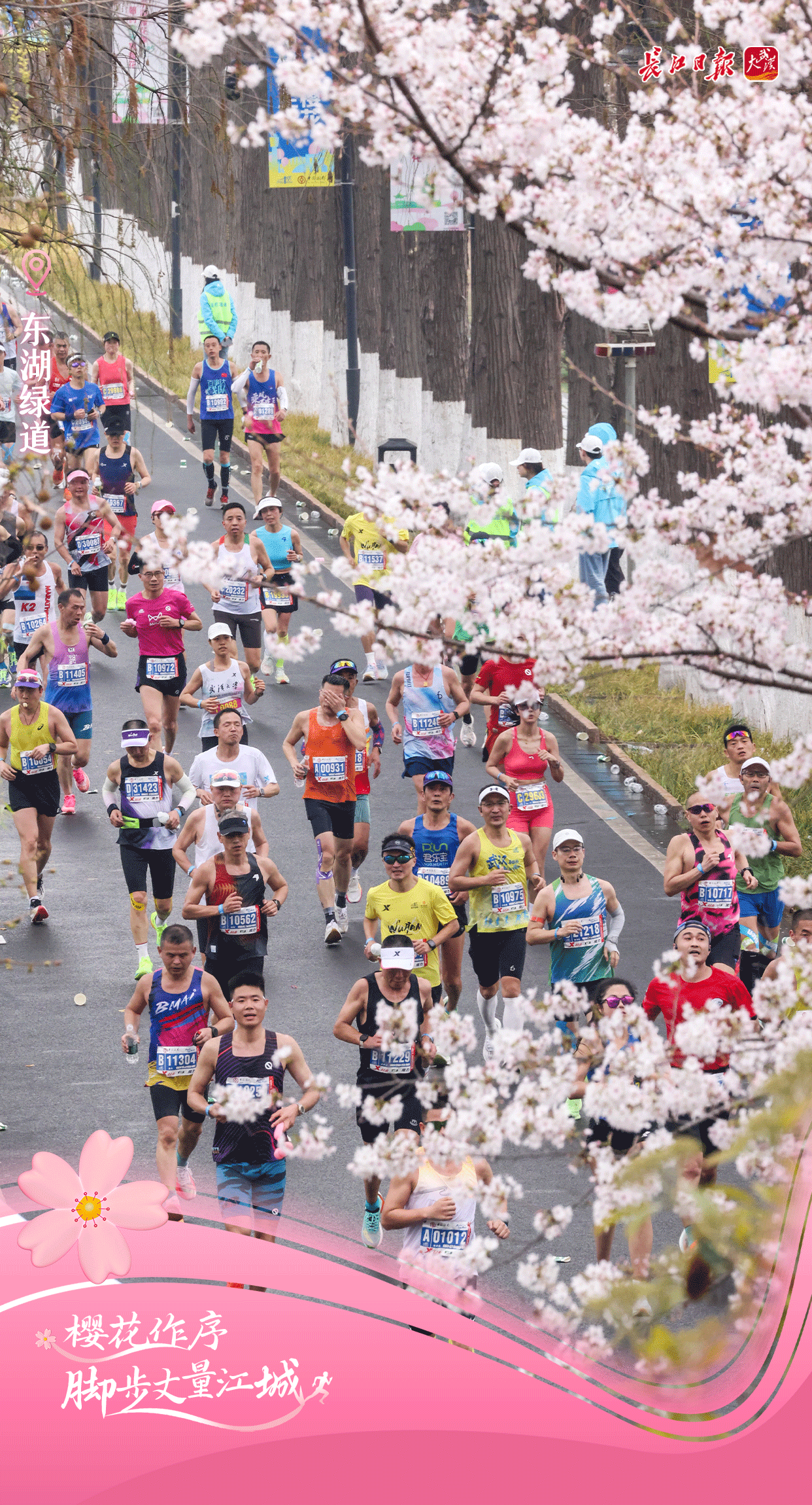 这次,武汉马拉松赛道两旁近3000株樱花怒放。“一城江水半程山,跑者皆是画中仙!”跑友朱起这样形容。