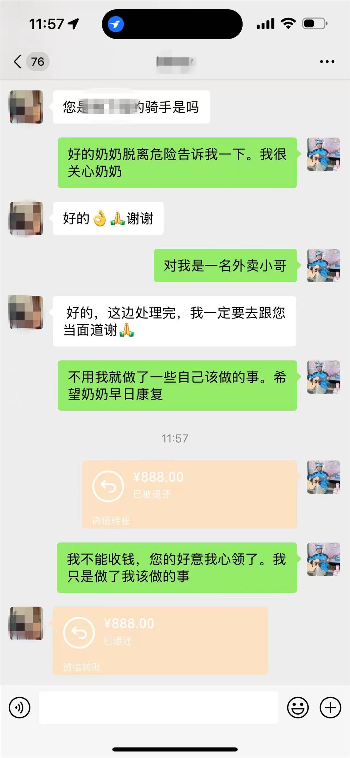 没想到,对方突然从微信给他转了888元,说:“今天多亏了你,这是我感谢你救我妈妈。”张宝剑当即拒绝,“我救人不是为了钱,于是把钱退了回去。结果对方又转了回来,于是坚持退了回去。”