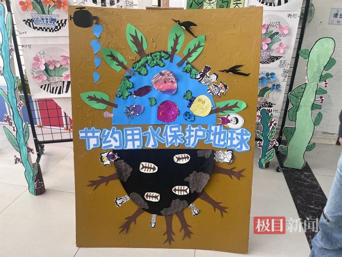 在创意环节中,萌娃们以童真视角创作完成了一幅寓意深刻的环保宣传画。该作品由民间河湖长、爱熙社工与班级教师联合指导,经孩子们集体构思、分工绘制而成。画面采用上下分区的对比式构图,上部以纯净的蓝绿色调铺陈,晶莹的水珠从龙头中倾泻而下,幻化成绿意繁茂的树木,水中可见大鱼小鱼轻舞,展现水生态系统的蓬勃生机;下部则运用灰黑冷色调形成视觉冲击,污浊的河水中散落着鱼骨。“小小河湖长”通过稚嫩的笔触传递深刻寓意:当象征生命的水流遭遇污染,自然生态将遭受不可逆的破坏。该作品也将会放置在幼儿园内,时刻提醒大家节约用水。