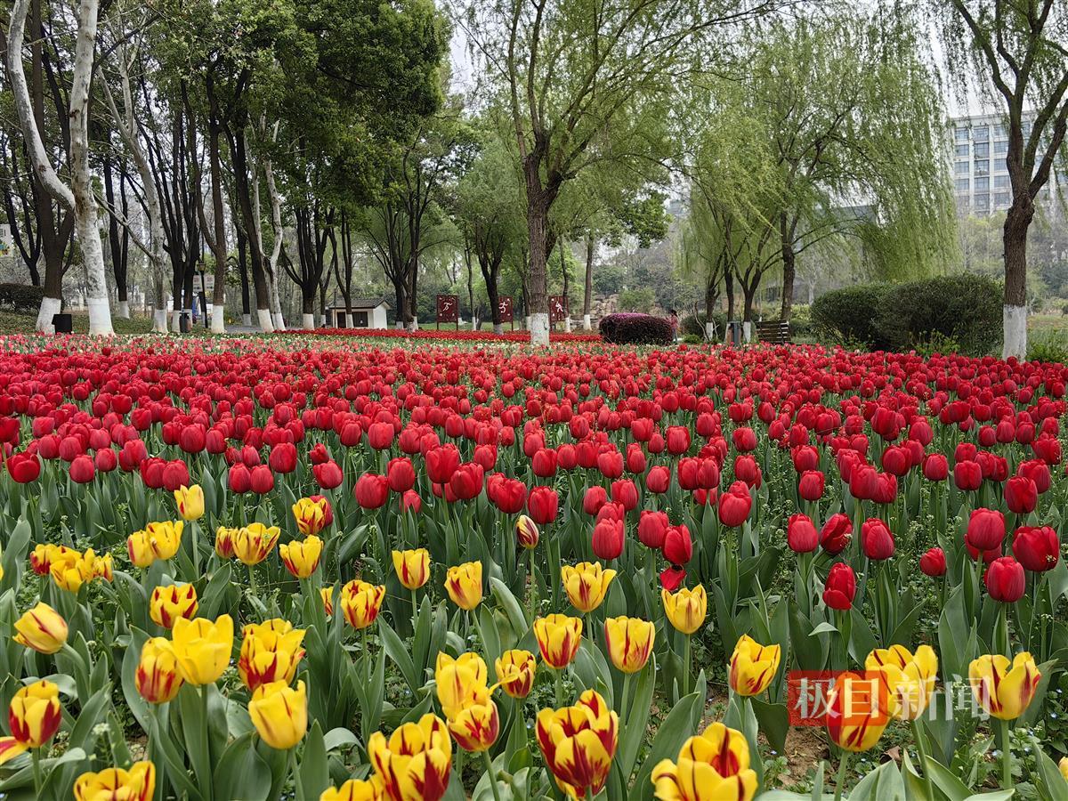 汤湖公园园林高级工程师熊育剑向极目新闻记者介绍,汤湖公园今年在公园中心区的儿童乐园到趣味篮球场之间的绿化带内种植了8万株郁金香,有达尔文家族和胜利家族系列品种上十个,占地近2000平方米。郁金香因家族品系不同,花期呈现有先有后陆续开放,花期从3月中旬持续到4月中上旬不等。