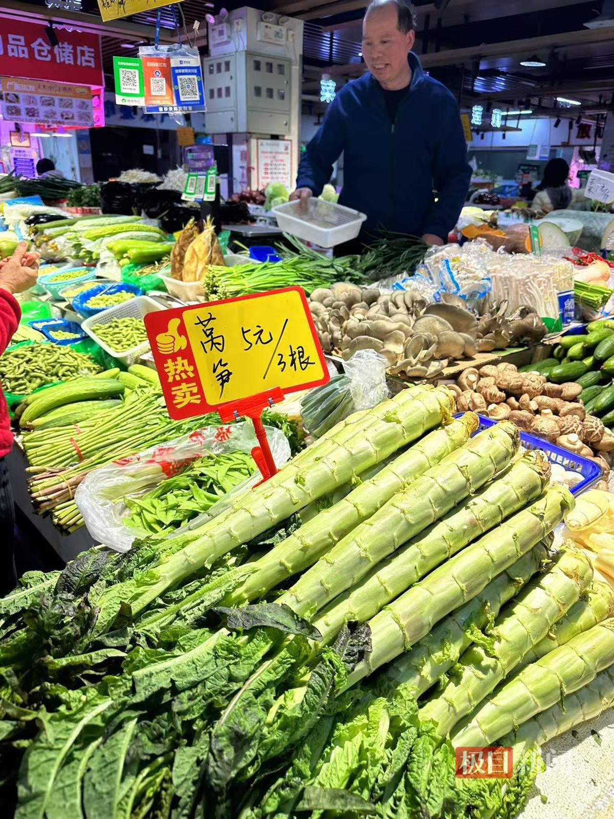 “这个菜很实惠新鲜。”市场蒋女士花了5块钱买了3根莴苣,商户高先生介绍,一根莴苣大约在2斤,售卖情况很好。
