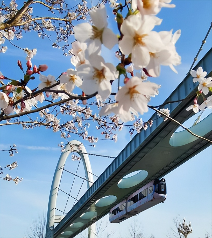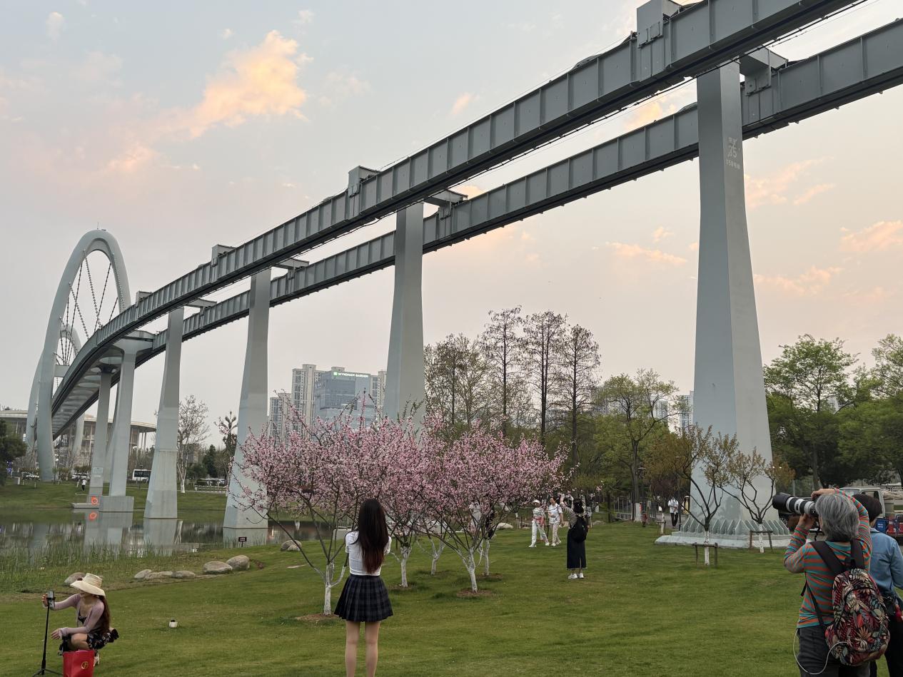 “我在空轨上看樱花,而你,在樱花丛中看空轨。”游客王女士开玩笑说,下了空轨,还要到西苑公园换个视角看樱花、拍空轨,“也是美极了!”
