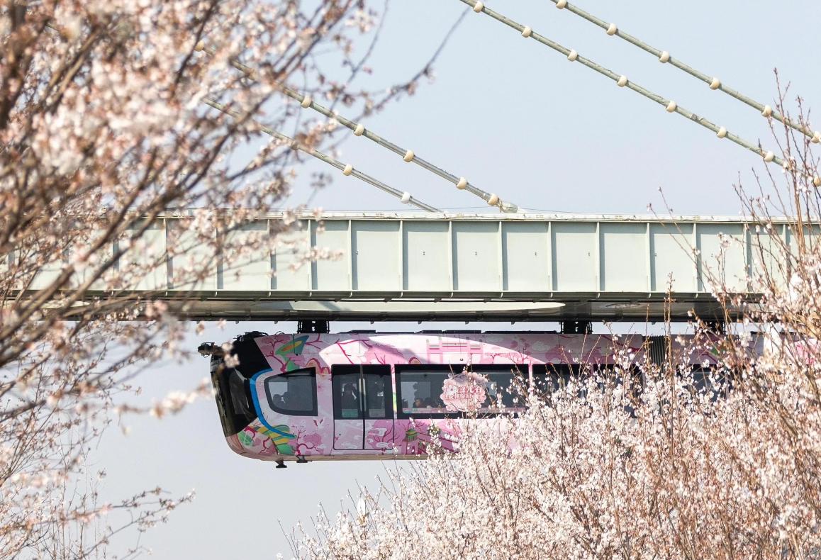据光谷空轨站点工作人员介绍,为了迎接樱花季,经过前期精心设计,今年3月12日对部分空轨列车进行了樱花主题装饰,13日正式运行。